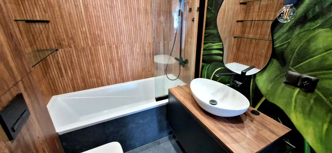 - łazienka wyposażona w: wannę z deszczownicą, wc, lustro, umywalkę, pralkę HAIER,