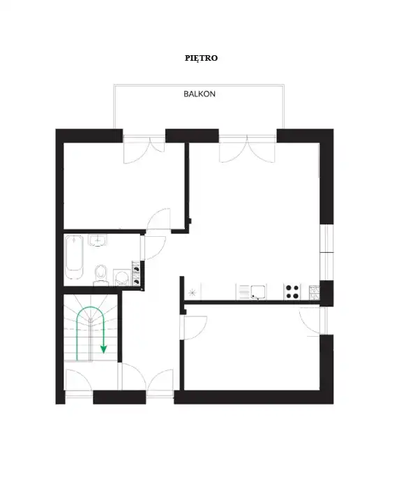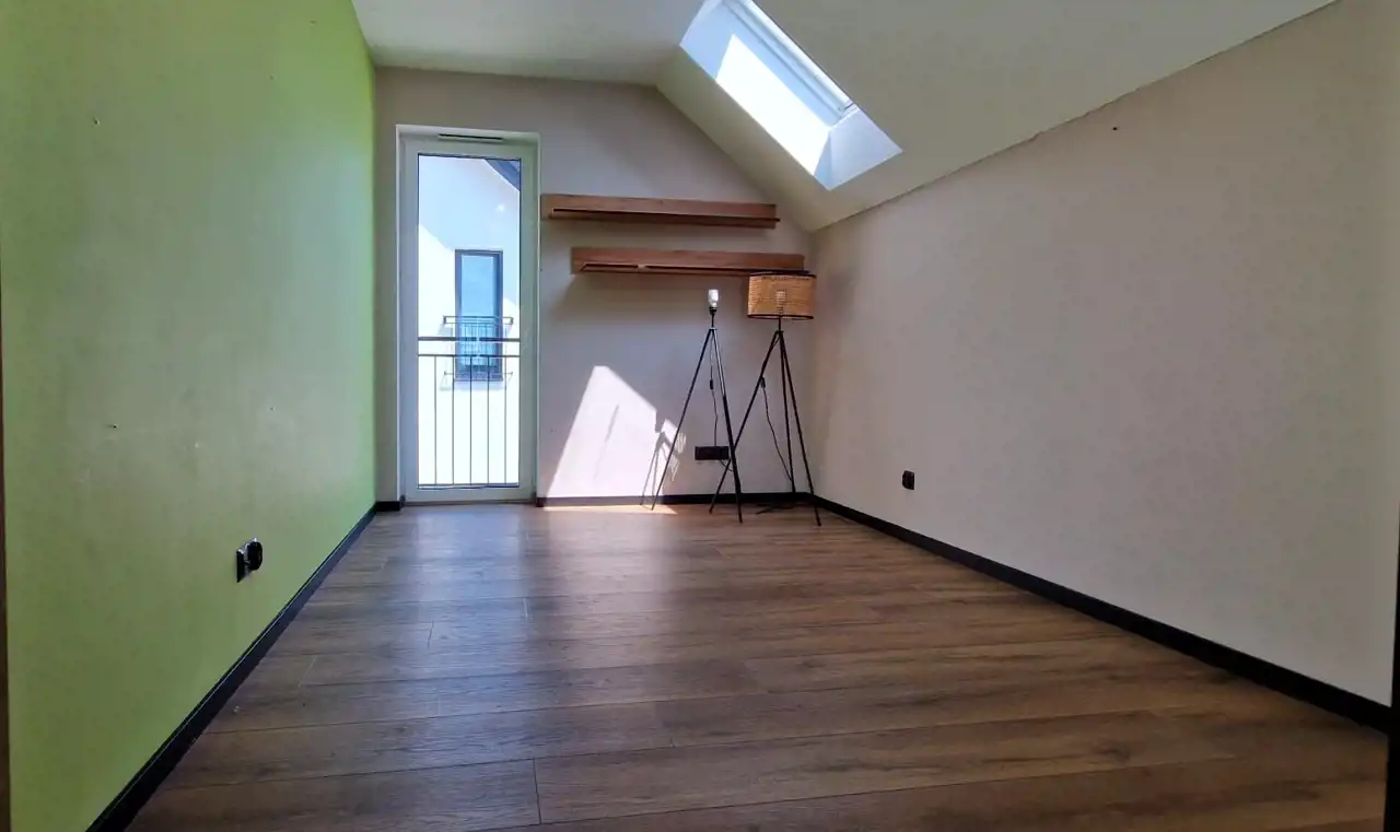 Piętro: klatka schodowa, przedpokój, salon z aneksem kuchennym, dwie sypialnie, łazienka + strych nieużytkowy przerobiony na pokój.