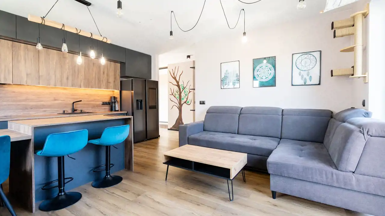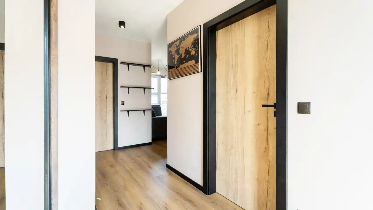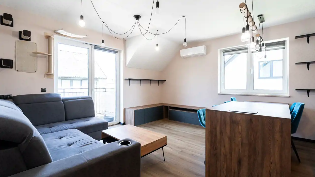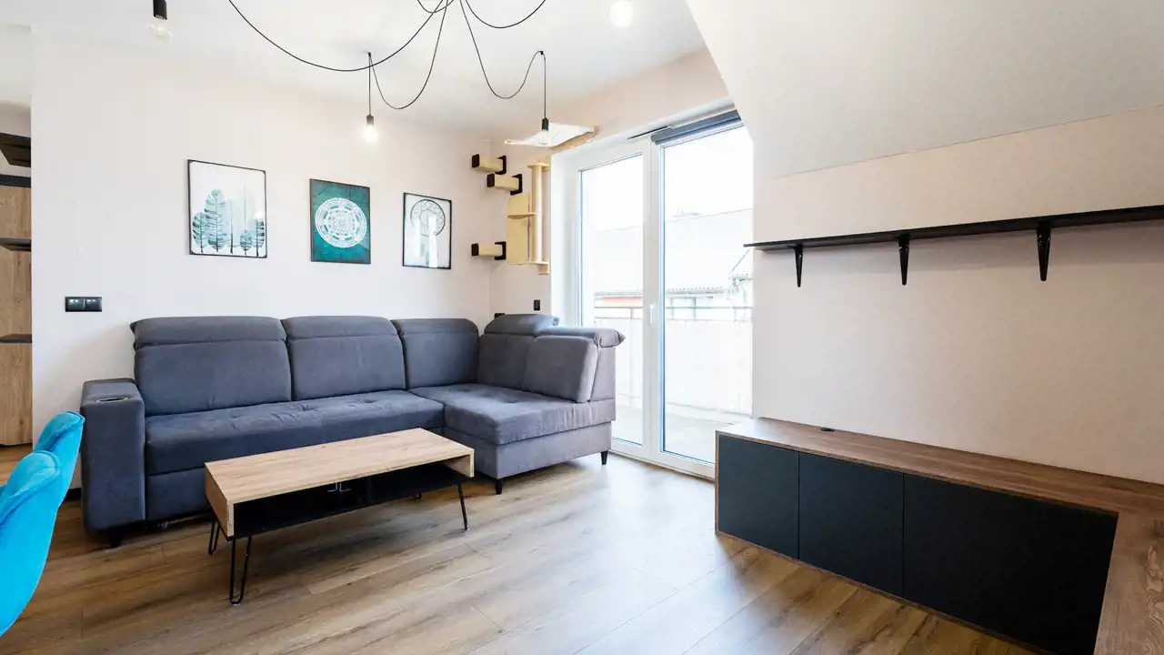 - przestronnego salonu połączonego z aneksem kuchennym oraz wyjściem na balkon,