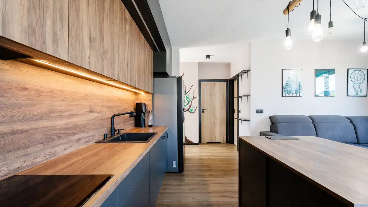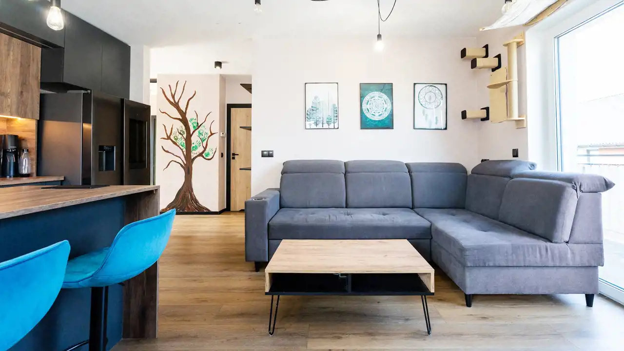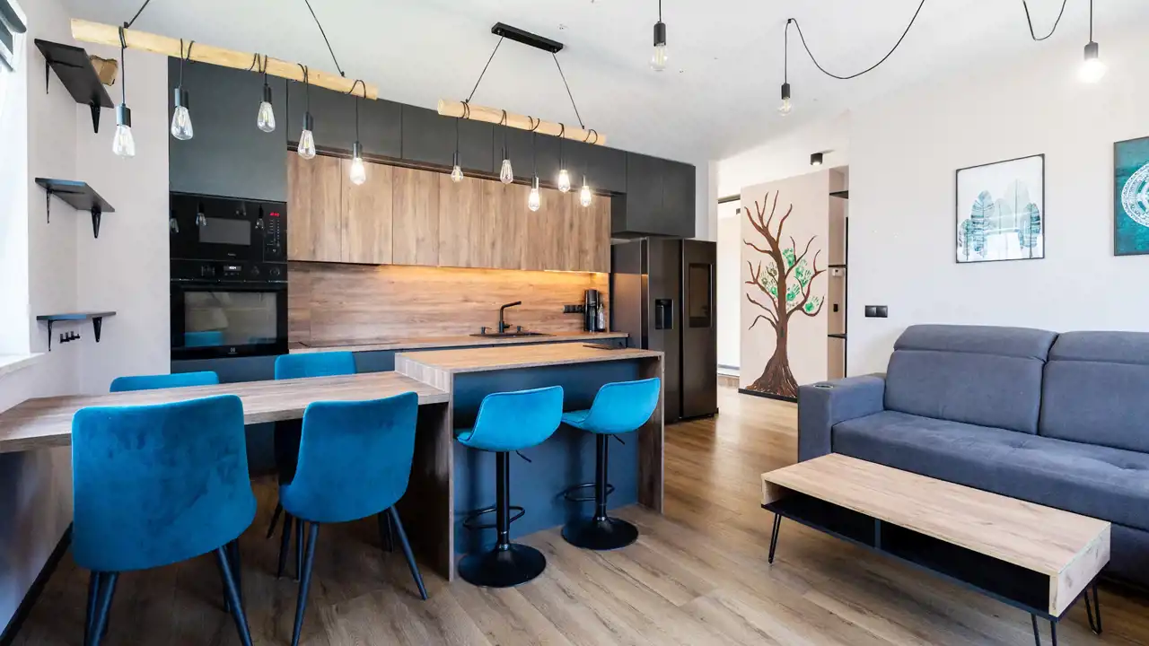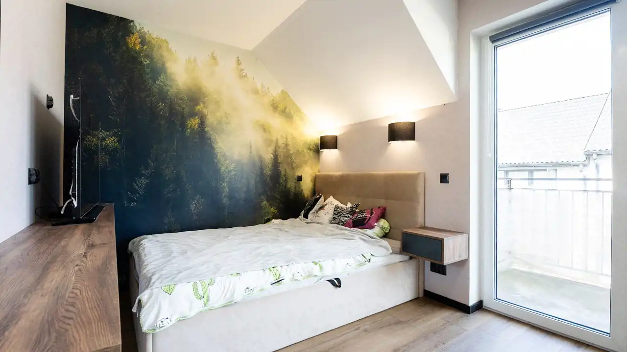 - przestronnego salonu połączonego z aneksem kuchennym oraz wyjściem na balkon,