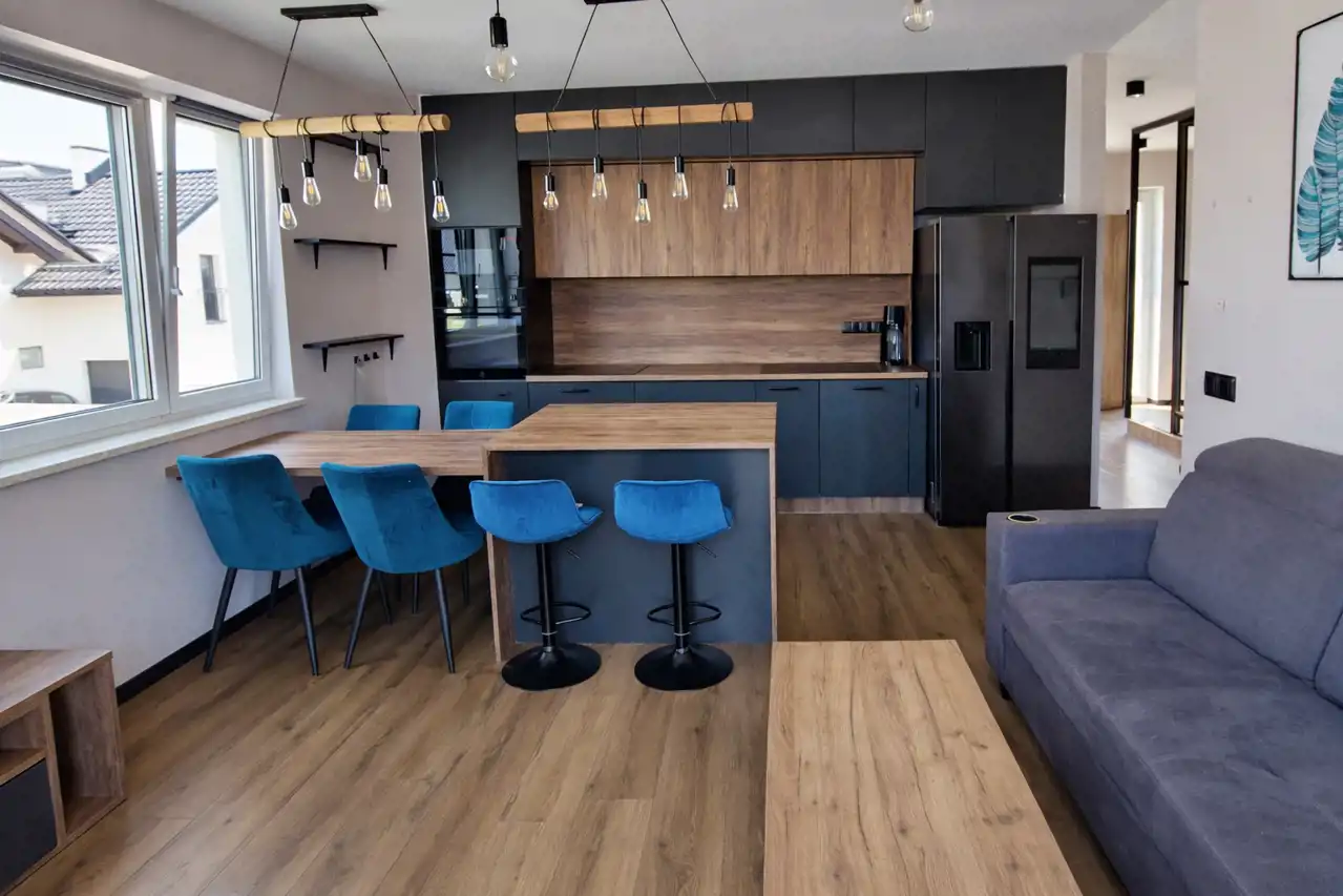 - kuchnia wyposażona w dużą nowoczesną lodówkę z kostkarką Samsung, płytę indukcyjną Elektrolux, zmywarkę Elektrolux, piekarnik Ellektrolux, mikrofala i okap firmy Amica.