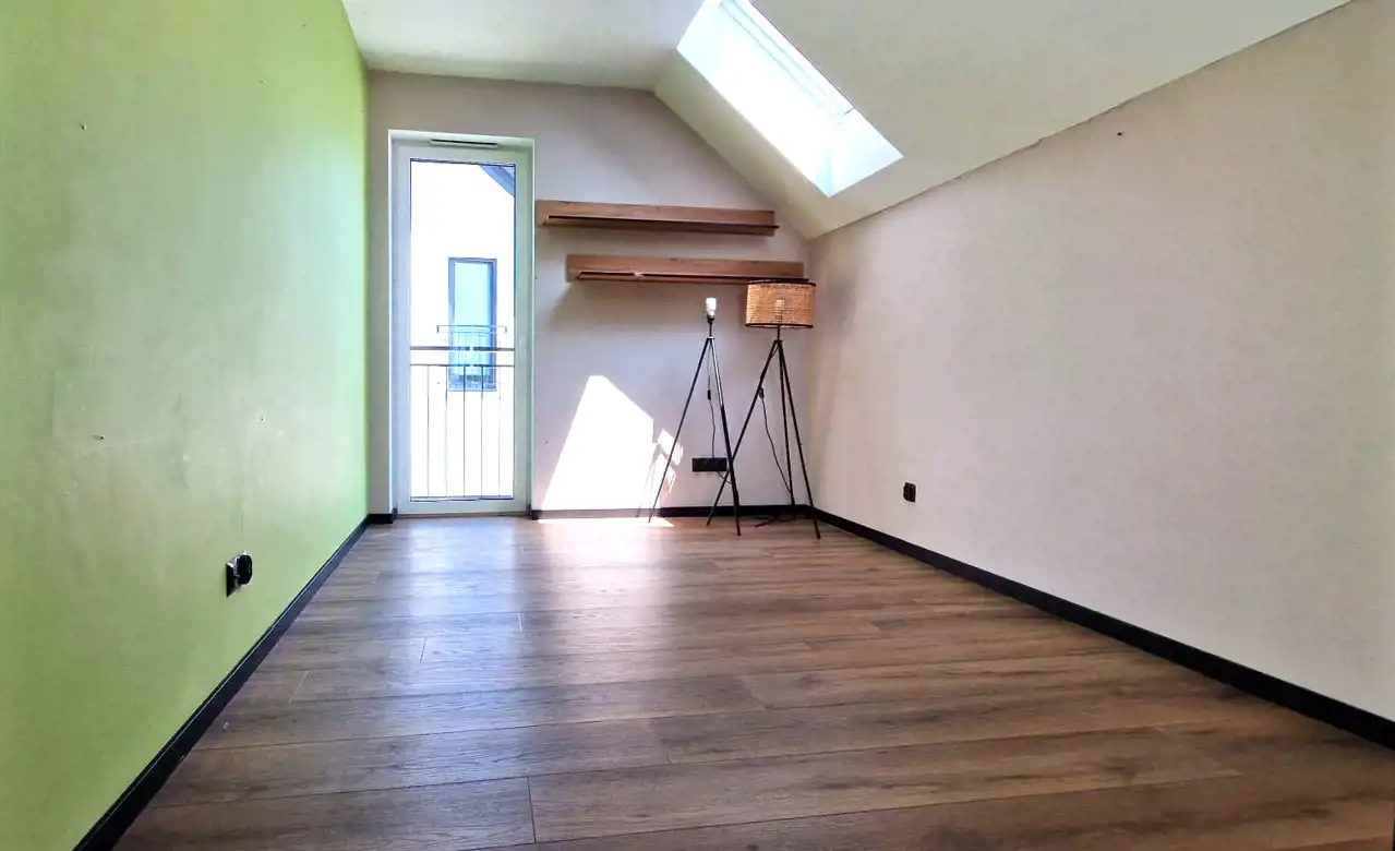 Piętro: klatka schodowa, przedpokój, salon z aneksem kuchennym, dwie sypialnie, łazienka + strych nieużytkowy przerobiony na pokój.