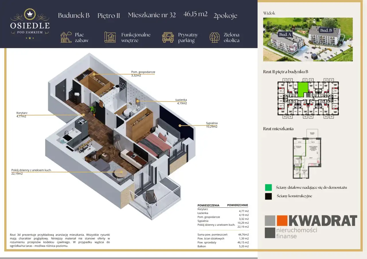 - Charakterystyka mieszkania 46.15 m2, 2 pokoje