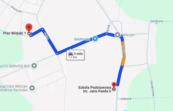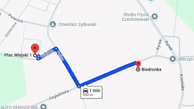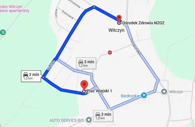 - Przychodnia – 3 minuty jazdy, 15 minut pieszo