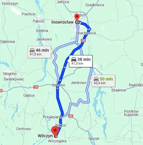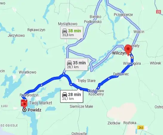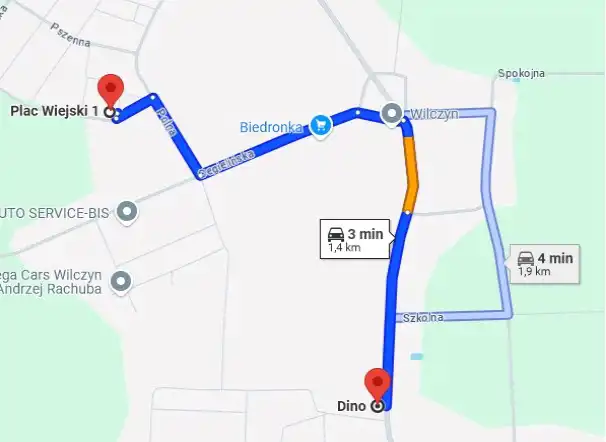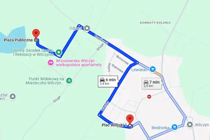 - Podstawowe punkty handlowe (dyskonty spożywcze, sklepy, etc.) – od 1 do 7 minut jazdy