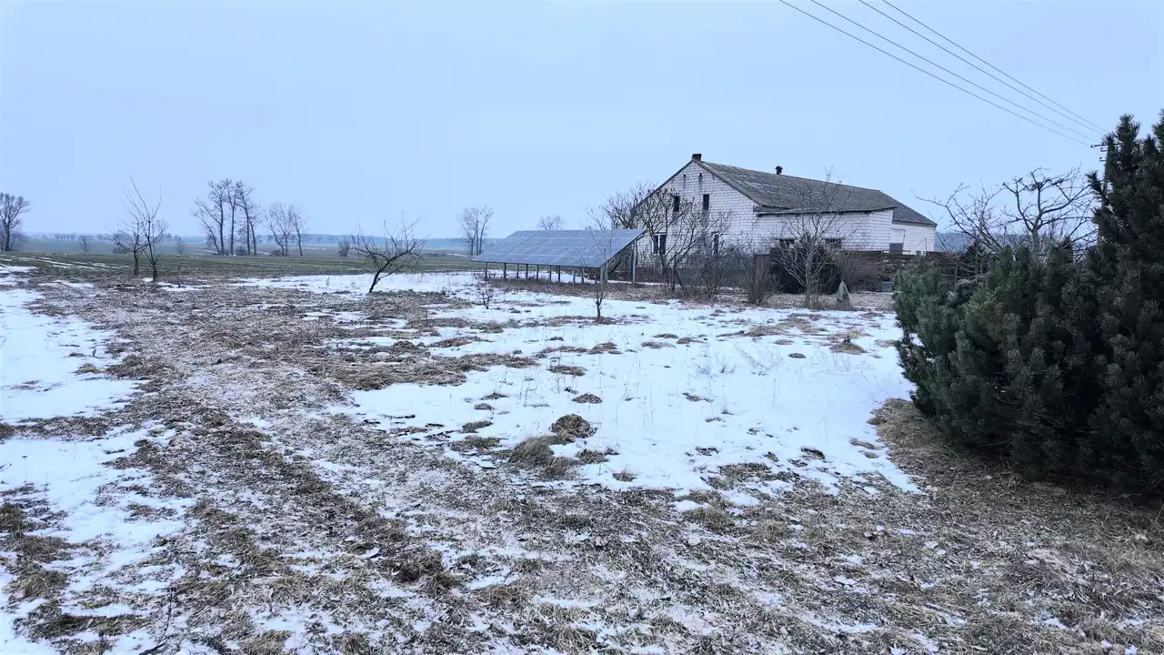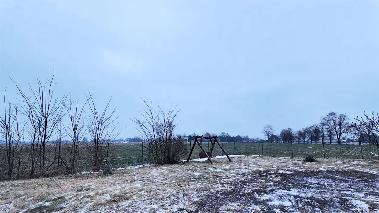 Ogrodzona siatką, z dojazdem asfaltowym, zabudowana dodatkowo stodołą i budynkiem gospodarczym z prądem. W sadzie rosną czereśnie, jabłoń i wiśnia — bo dom to nie tylko mury, ale i codzienne przyjemności.