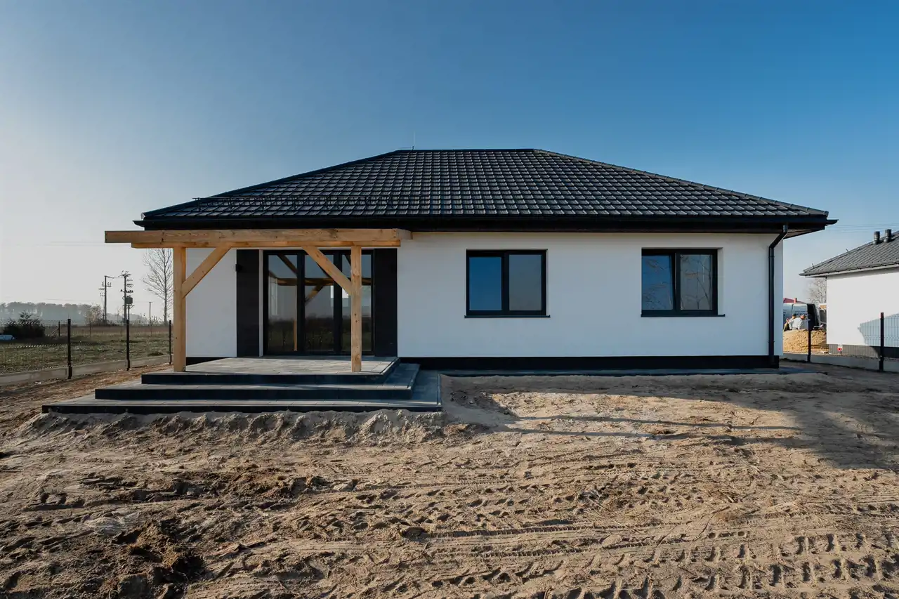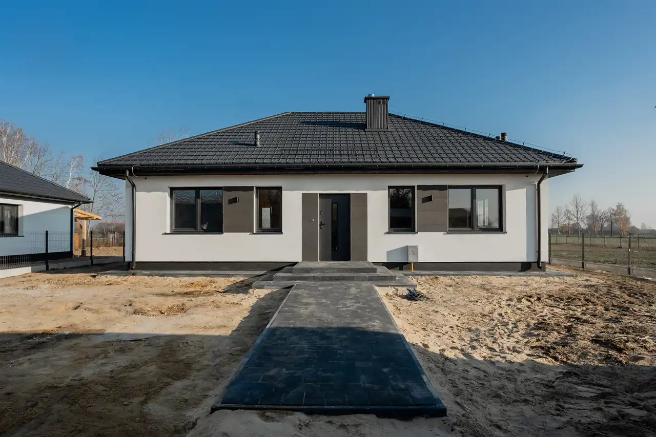 Drugi etap inwestycji w w sielskiej wsi Kamionna gm. Winnica, powiat pułtuski, koło Nasielska. W ofercie dom parterowy o powierzchni 95 mkw w stanie deweloperskim, posadowiony na działce 1362 mkw (nr ew. 32/30). Dom wzniesiony w technologii tradycyjnej, murowanej, ściany z pustaków ceramicznych. Dach pokryty blachodachówką w kolorze grafit. Okna trzyszybowe. Rozprowadzona instalacja wodna, elektryczna i gazowa (ogrzewanie podłogowe). Działka zagospodarowana: ogrodzona systemem panelowym z bramą i furtką; chodnik do drzwi wejściowych; opaska wokół domu; taras z drewnianą pergolą. Garaż blaszany 2-stanowiskowy na fundamencie za dodatkową opłatą 20 tys.