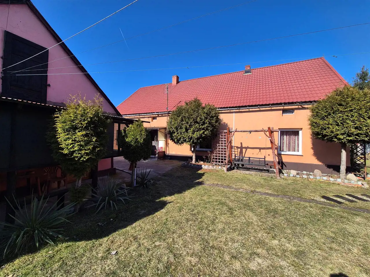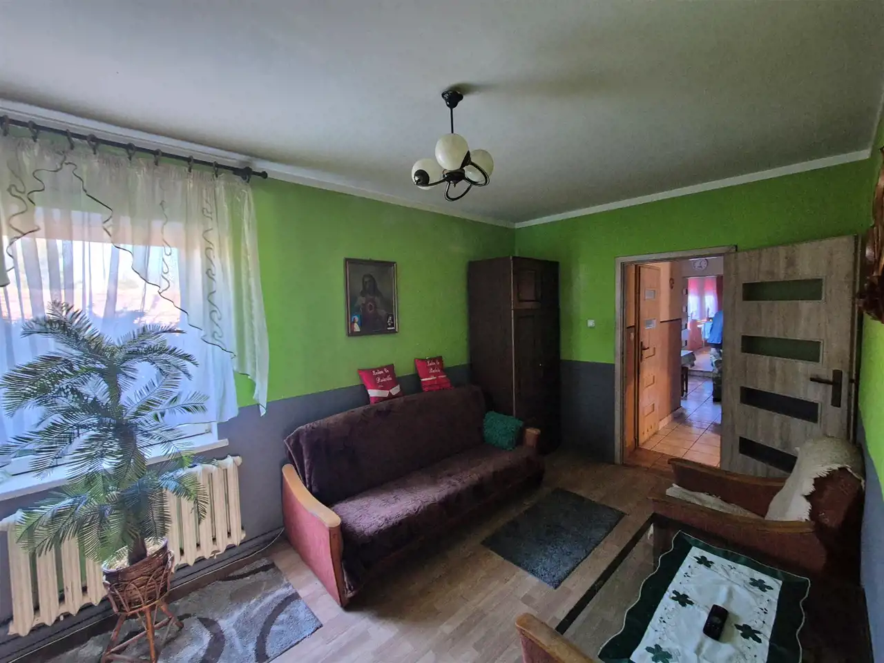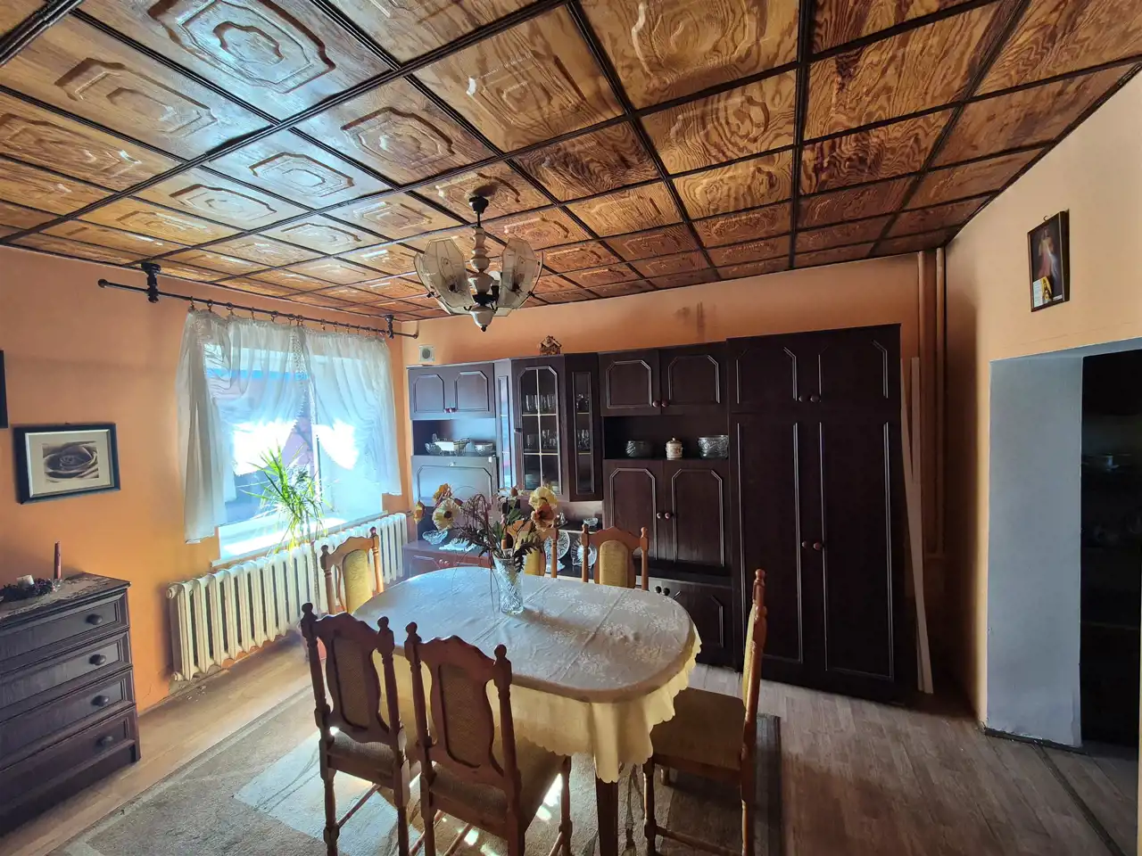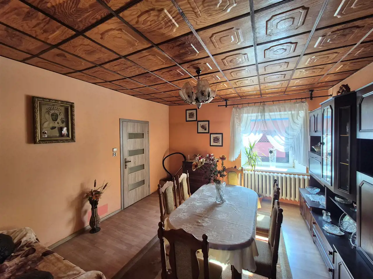 Duży podpiwniczony dom o wymiarach 9m x 17.3m, składa się z siedmiu pokoi, przedpokoju ,łazienki z wc , jasnej kuchni oraz strychu.