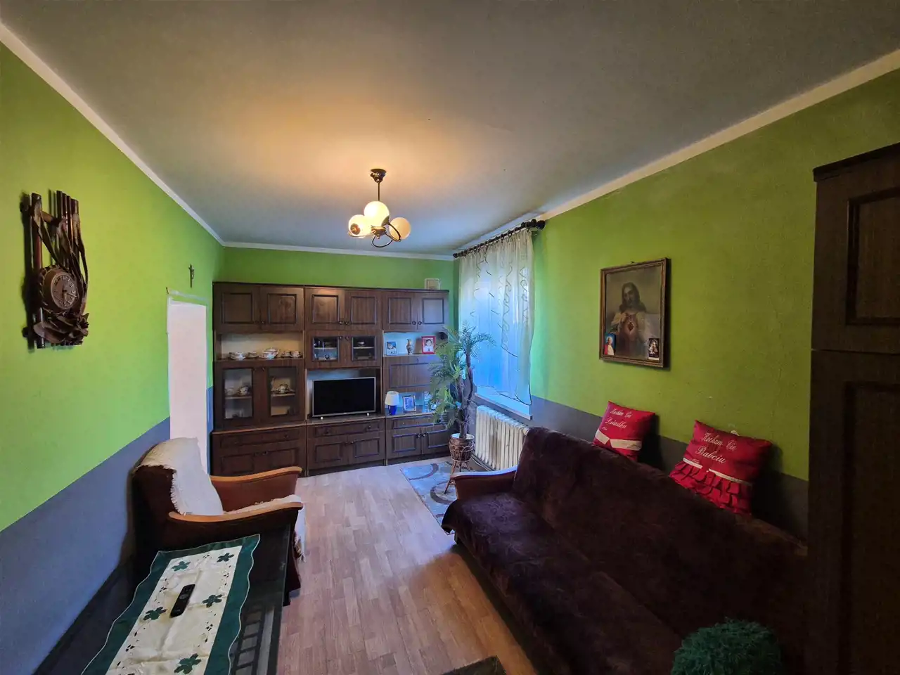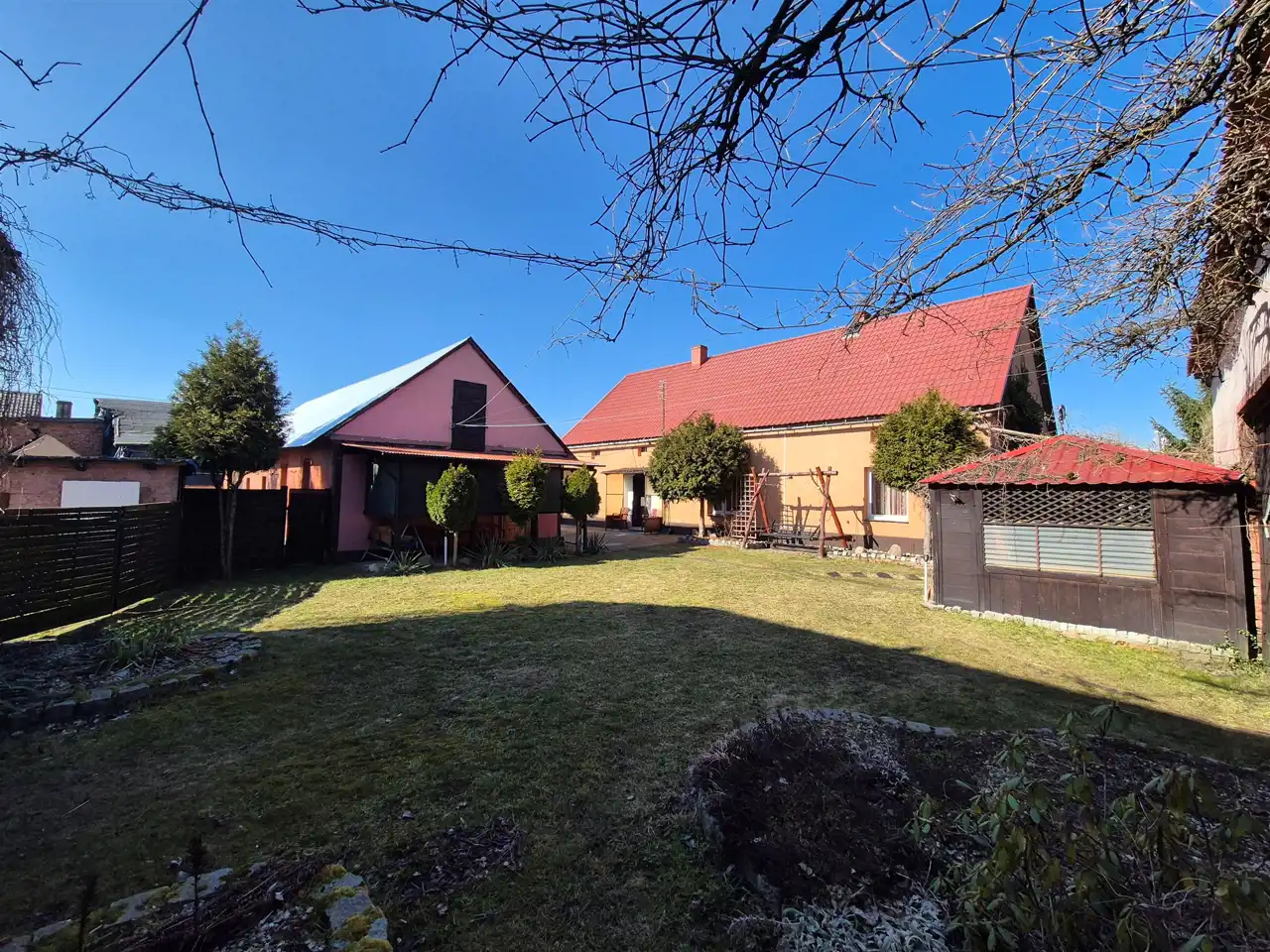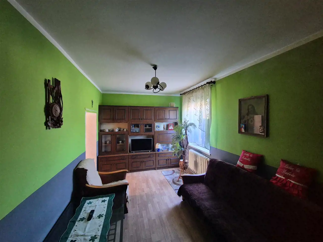 Duży podpiwniczony dom o wymiarach 9m x 17.3m, składa się z siedmiu pokoi, przedpokoju ,łazienki z wc , jasnej kuchni oraz strychu.