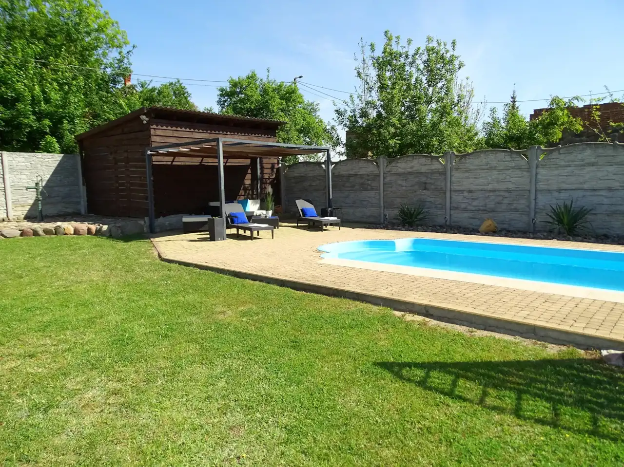 - pomieszczenia gospodarczego na meble, sprzęt ogrodowy i pompę do basenu,