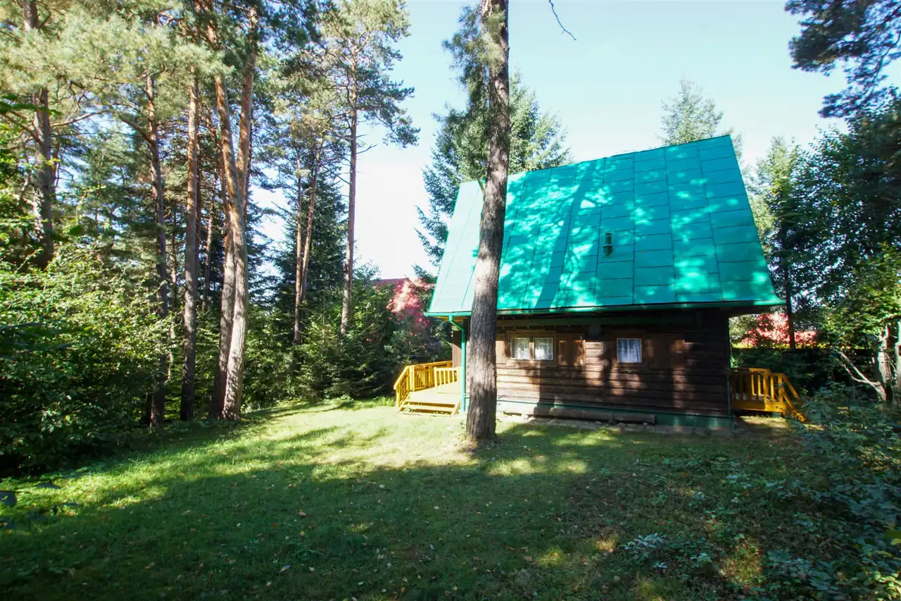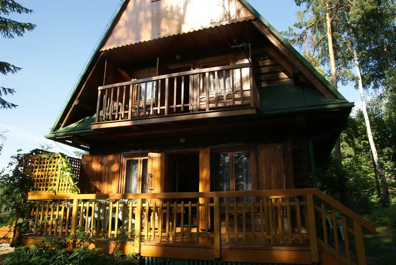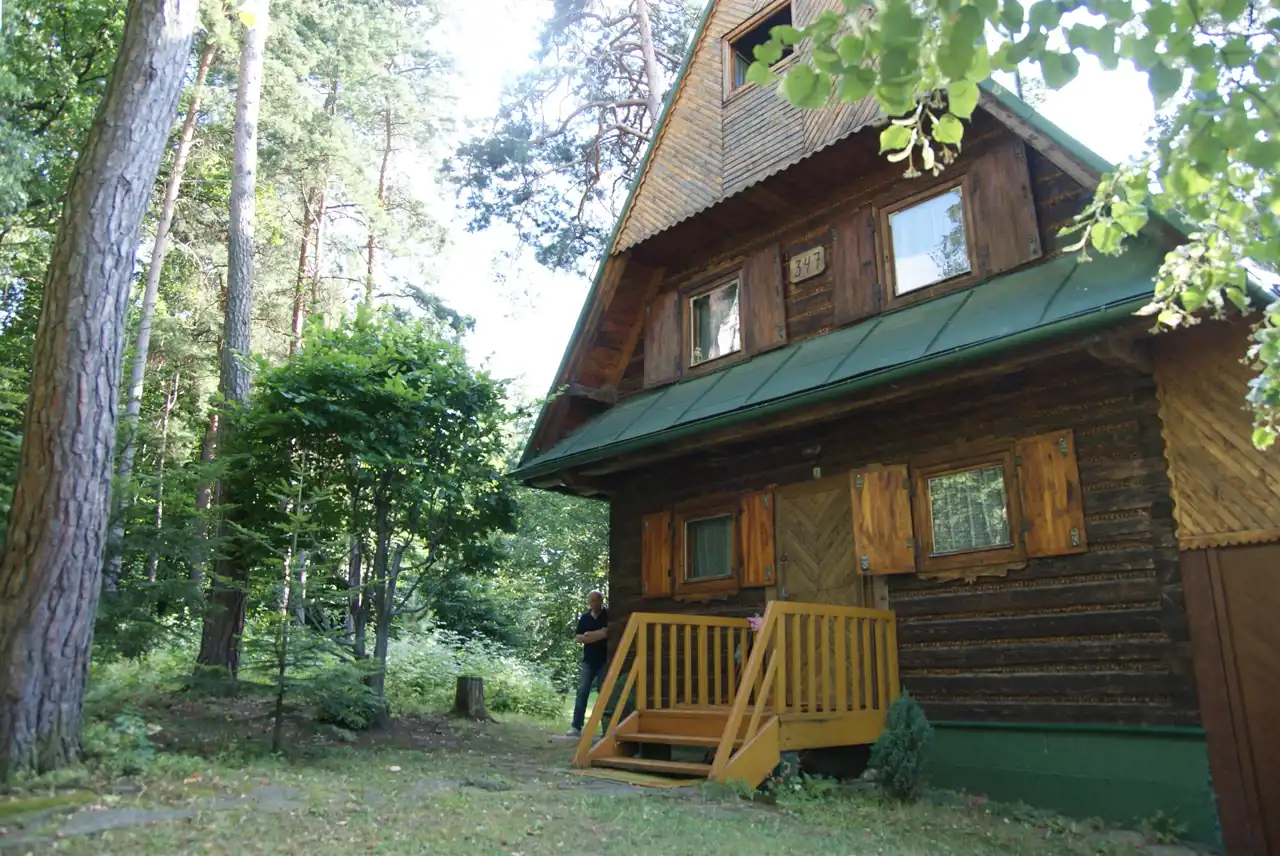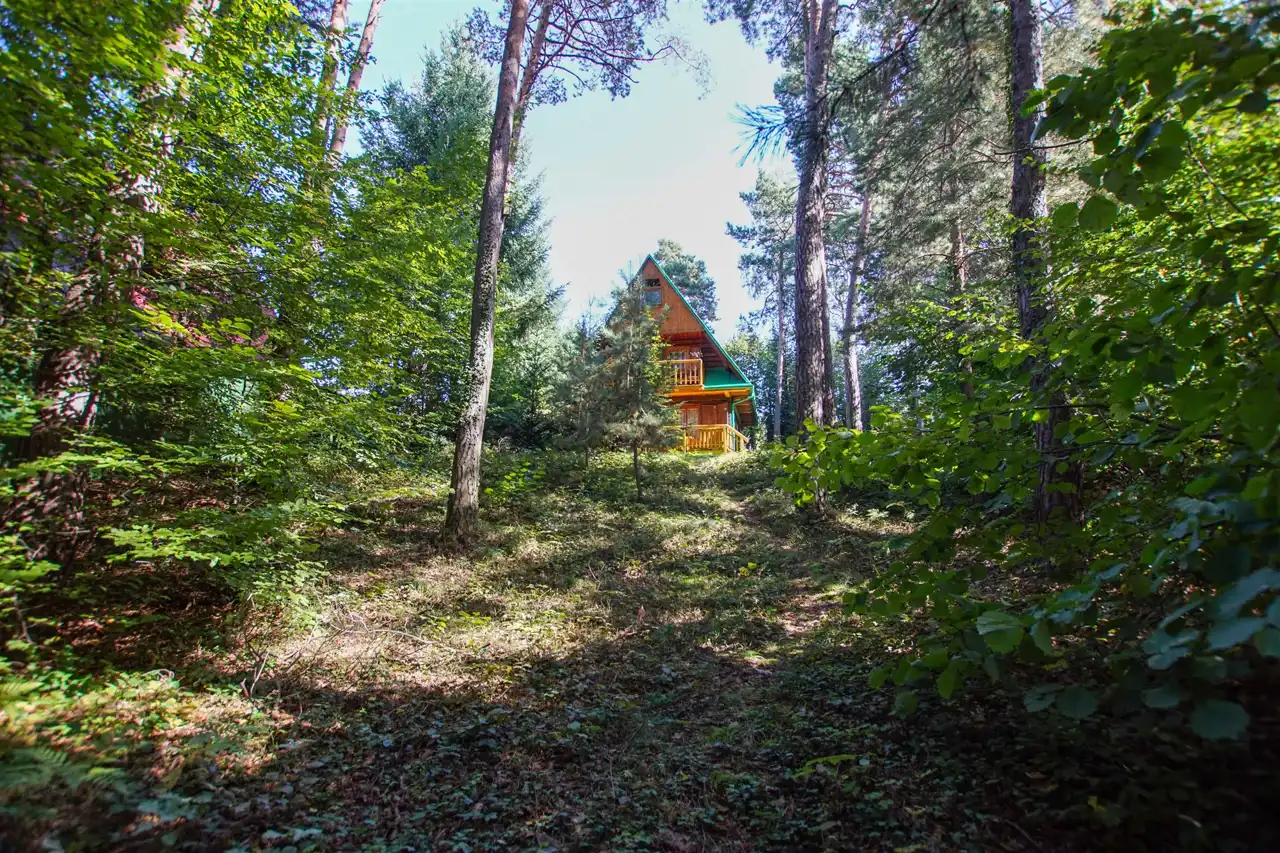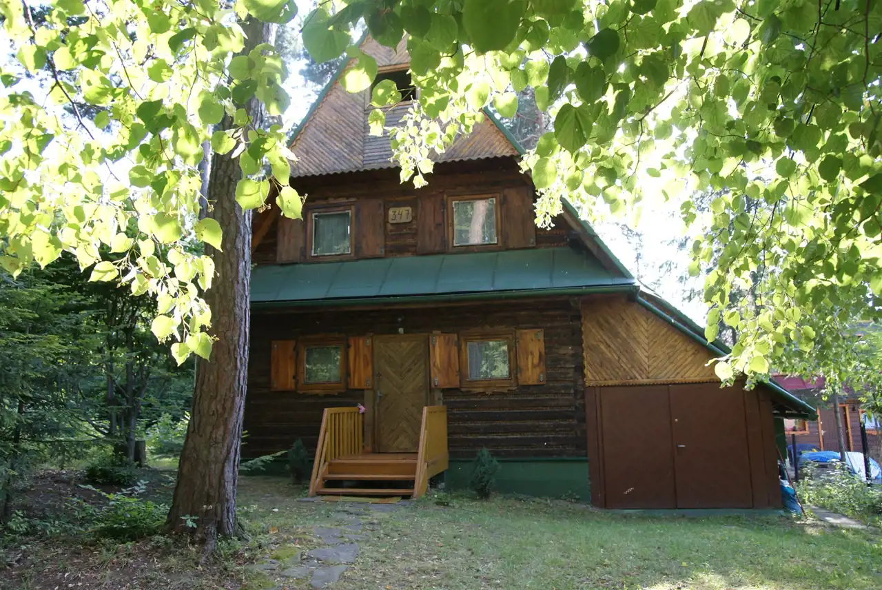 LETNISKOWY DOM z bali położony na skraju miasteczka, pod lasem, na dużej zalesionej działce ze strumykiem