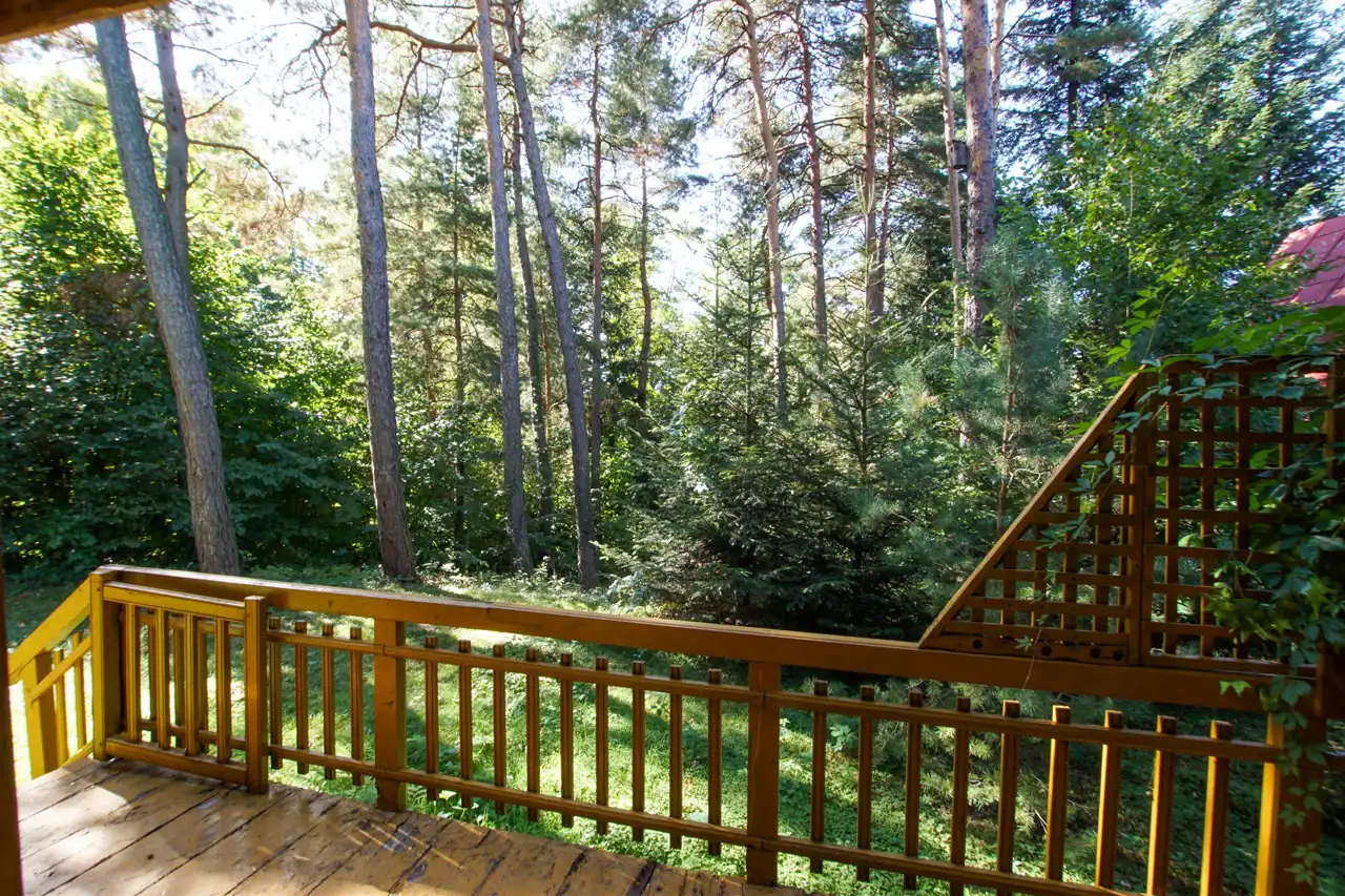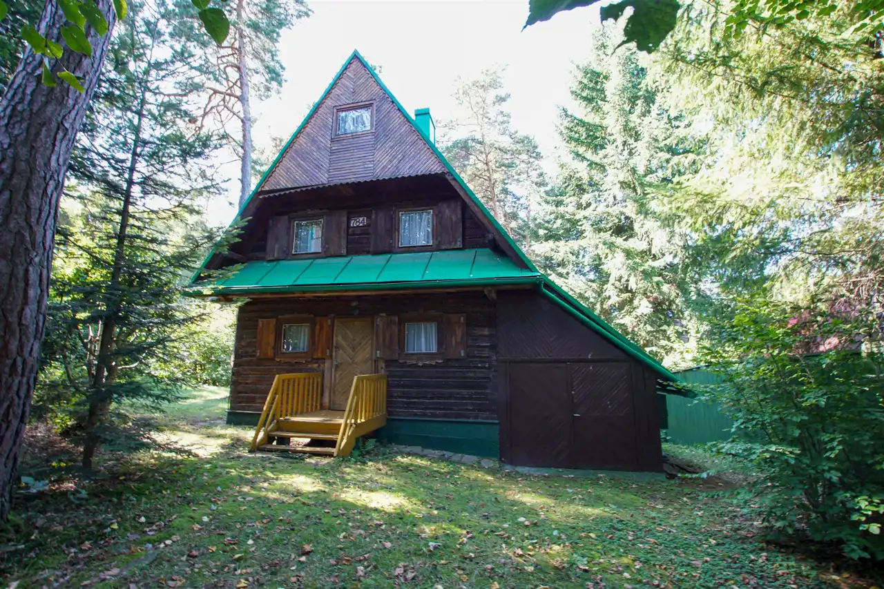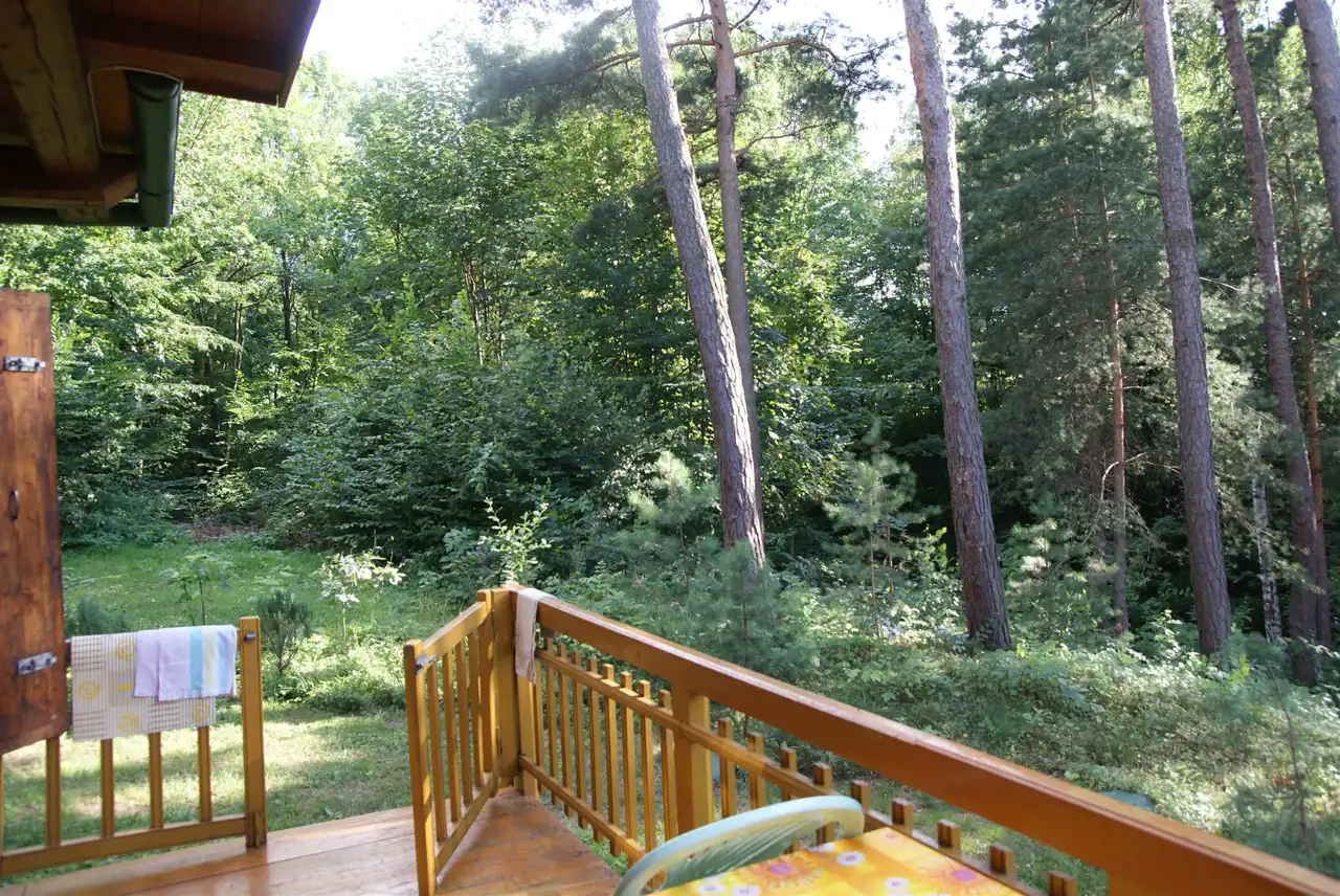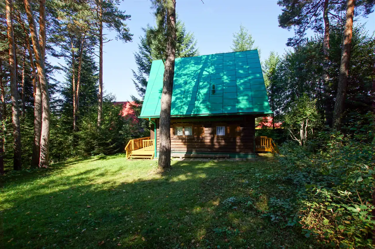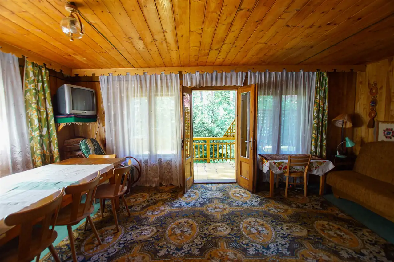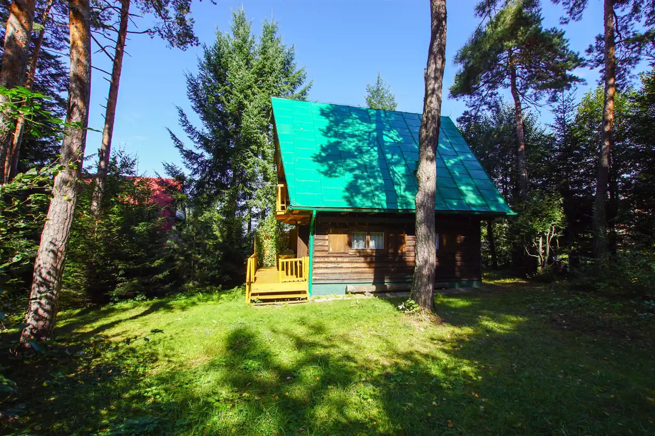 LETNISKOWY DOM z bali położony na skraju miasteczka, pod lasem, na dużej zalesionej działce ze strumykiem