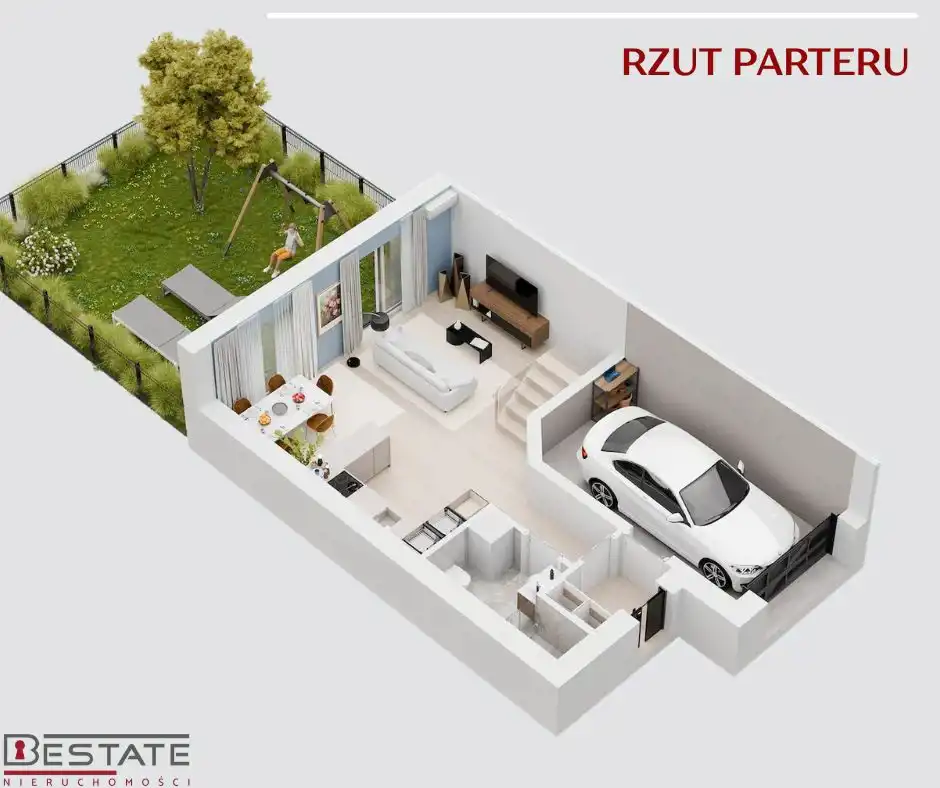 Parter - przestronny salon z aneksem kuchennym o pow. 32,78m.kw, z wyjściem na ogródek o pow. 40 m.kw, łazienka o pow. 4,41m.kw, wiatrołap o pow. 2,38m.kw. oraz garaż w bryle o pow. 15,16m.kw.