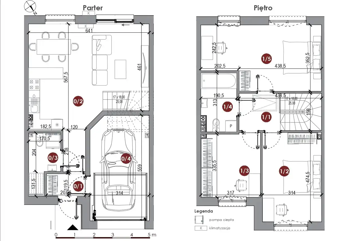 Piętro- dwie sypialnie o pow. 20,07m.kw i 14,59m.kw, garderoba o pow. 10,48m.kw, łazienka z wc o pow. 5,56m.kw oraz korytarz o pow. 4,20m.kw.