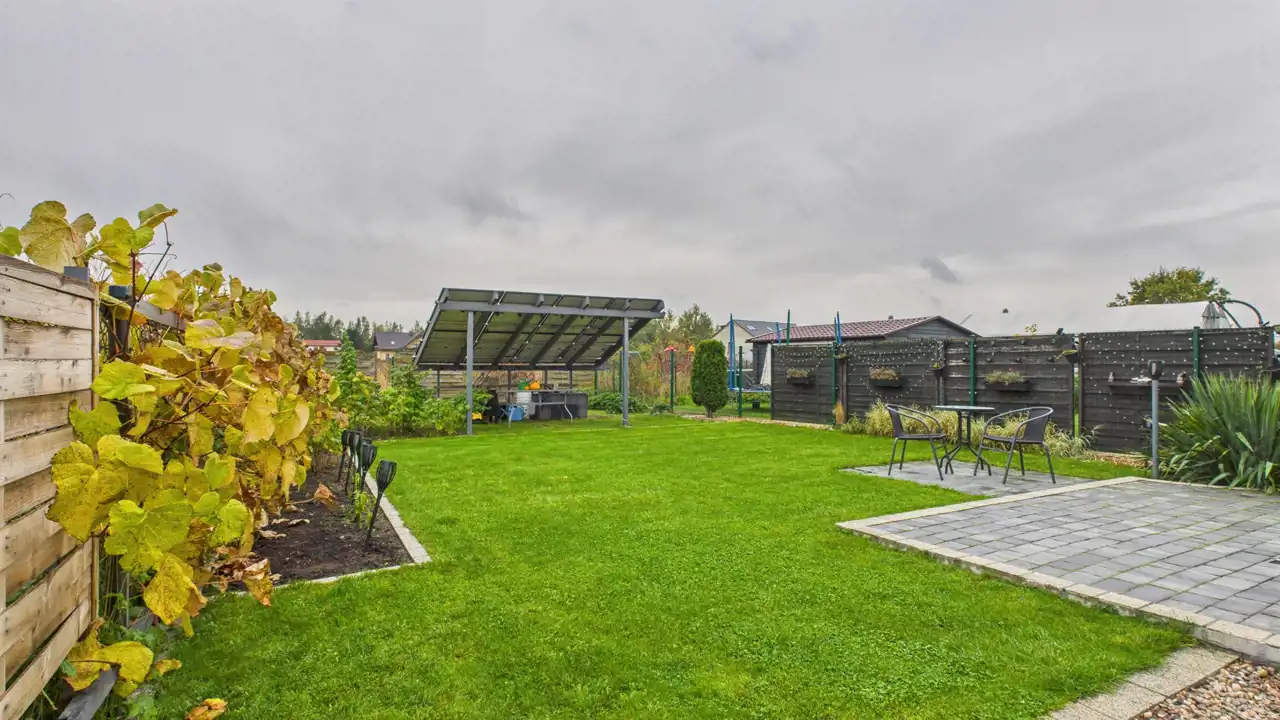 zamontowany jest zestaw paneli fotowoltaicznych o mocy 3 kW, umieszczonych na solidnym stelażu. Instalacja służy obecnie do ogrzewania wody użytkowej w domu, co znacząco obniża koszty eksploatacji.