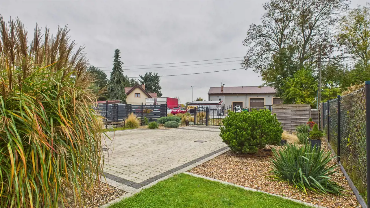 zadbany, wybrukowany podjazd z miejscem parkingowym dla 3–4 samochodów,