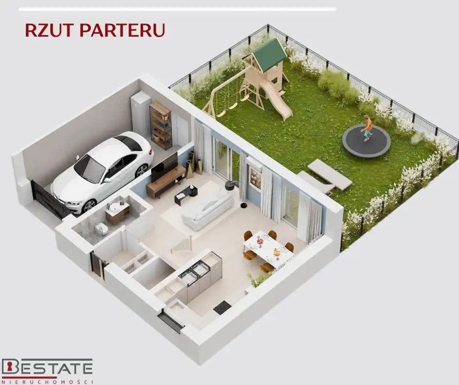 Parter - przestronny salon z aneksem kuchennym o pow. 35,97m.kw, z wyjściem na ogródek o pow. 97 m.kw, łazienka z wc o pow. 3,52m.kw oraz wiatrołap o pow. 2,48m.kw.