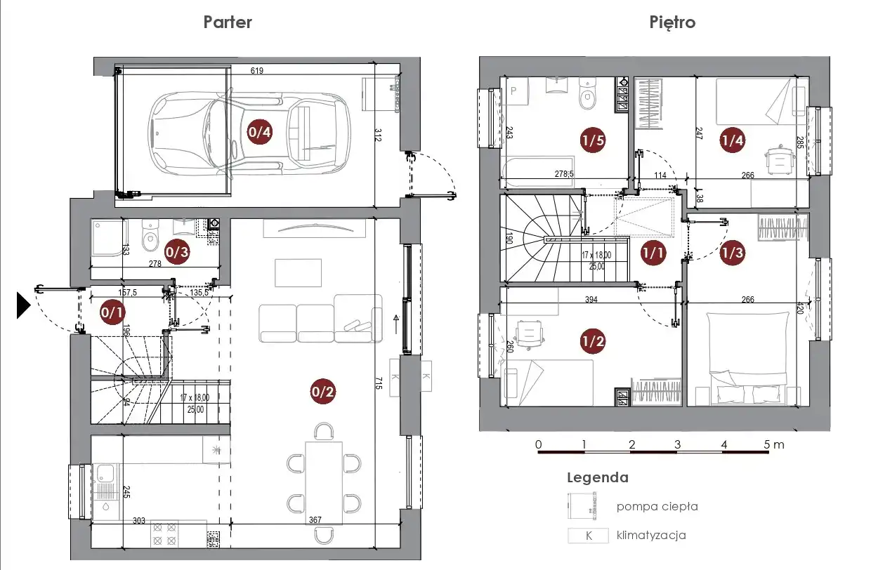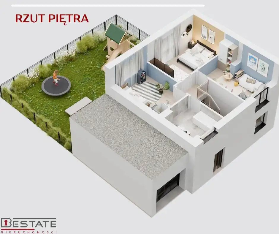 Piętro- trzy sypialnie o pow. 10,95m.kw, 10,19m.kw. i 9,77m.kw, łazienka z wc o pow. 6,41m.kw oraz korytarz o pow. 3,08m.kw. Możliwość własnych aranżacji i zmiany pomieszczeń.