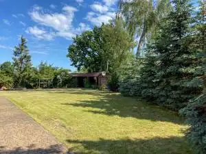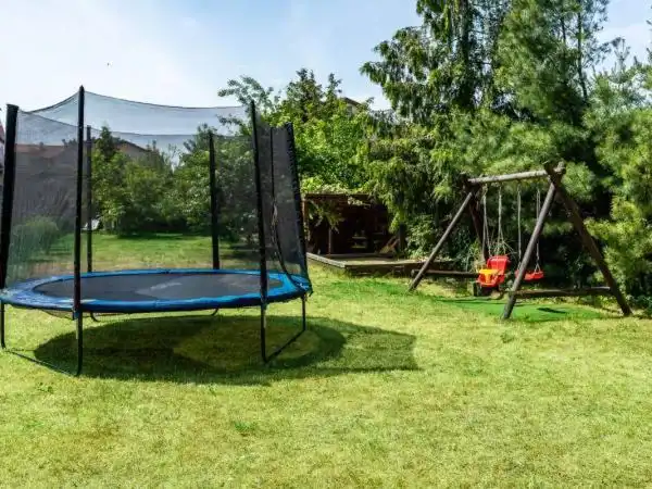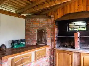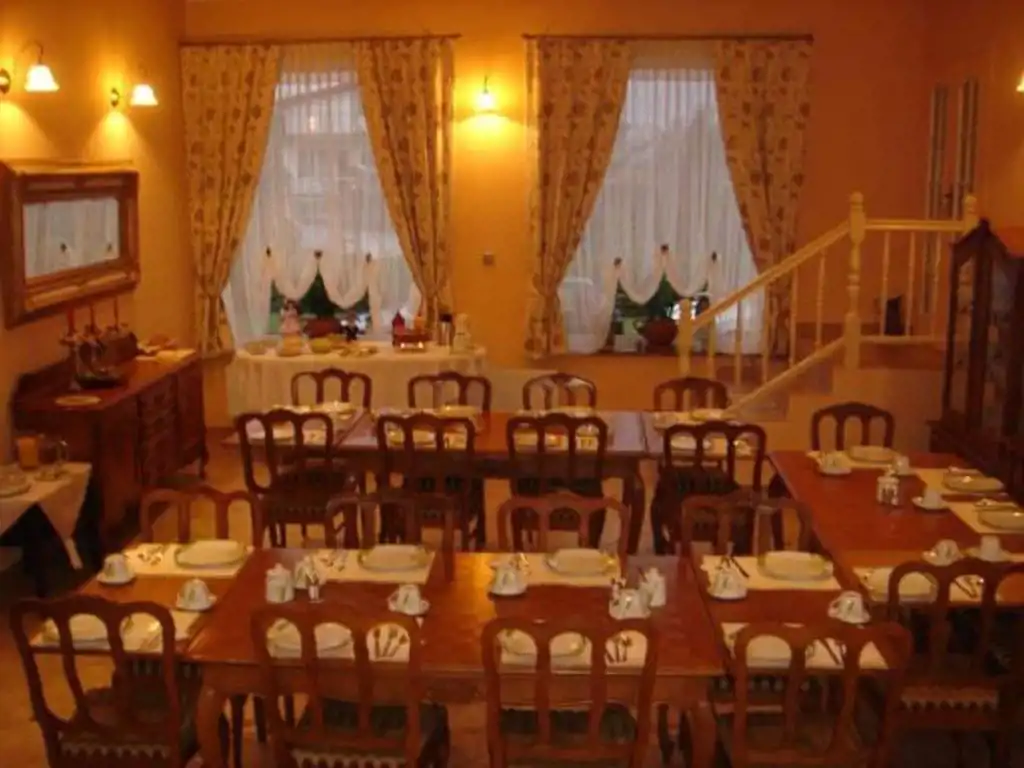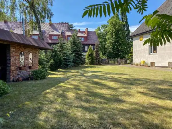 W przyziemiu znajdują się dwa pokoje z łazienką z oddzielnym wejściem od strony ogrodu oraz kotłownia z piecem gazowym. Na parterze znajduje się: sypialnia z garderobą łazienką i antresolą, salon z barem o pow. 80 m2, sala bilardowa z wc o pow. 41 m2, kuchnia, spiżarnia, 2 pokoje z łazienkami. Na piętrze znajduje się: 8 pokoi z łazienkami. Strych do zagospodarowania. Na terenie nieruchomości znajduje się zadaszone miejsce wypoczynku pod stu letnim dębem ze strefą telewizyjną, grillem i wędzarnią, miejsce zabaw dla dzieci i parking na samochody. Ogrzewanie gazowe.