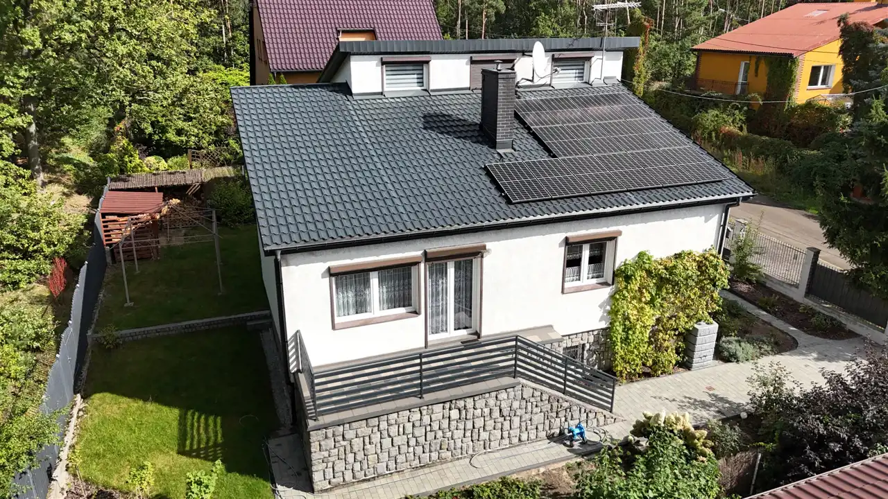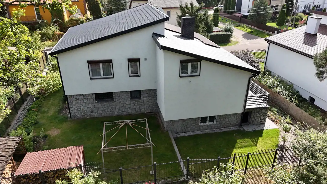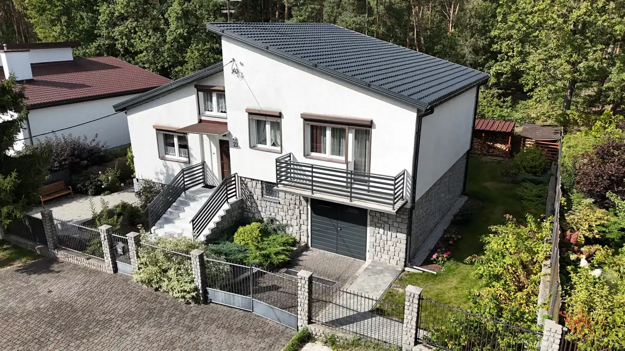 Dom wybudowany w 1991r. w technologi tradycyjnej z cegły i suporeksu, docieplony styropianem i pokryty tynkiem strukturalnym i kamieniem, z nowym dachem dwuspadowym wyremontowanym w 2020r, pokrytym blachodachówką i panelami fotowoltaicznymi o mocy 5 KW. Ponad to oprócz dachu w 2021r przeprowadzono remont generalny m.in. instalacja nowego kominka, nowych balustrad na balkonie i tarasie, drzwi garażowych, schodów i balustrad głównego wejścia itp.