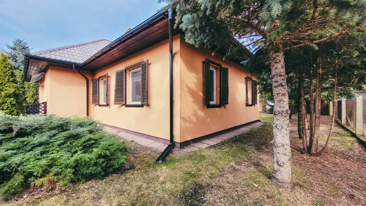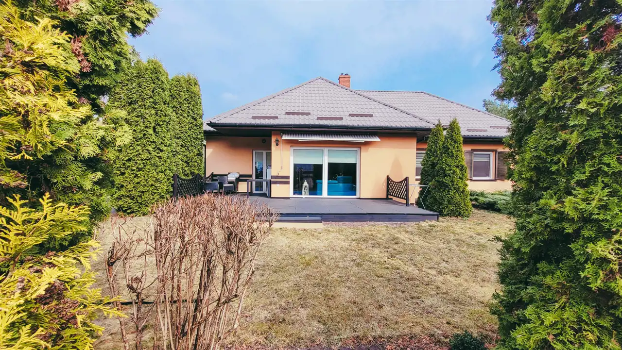 Dom wybudowany z pustaka (porotherm), ocieplony, ze kopertowym dachem pokrytym blachodachówką w bdb stanie. Sprawne instalacje (elektryczną na miedzi). Okna PCV z moskitierami, drzwi tarasowe przesuwane HST, drzwi wewnętrzne z litego drewna. Podłogi pokoi panele, łazienka oraz kuchnia w płytkach. Ściany pokryte tynkami gipsowymi. Stropy wykonane z płyt betonowych.