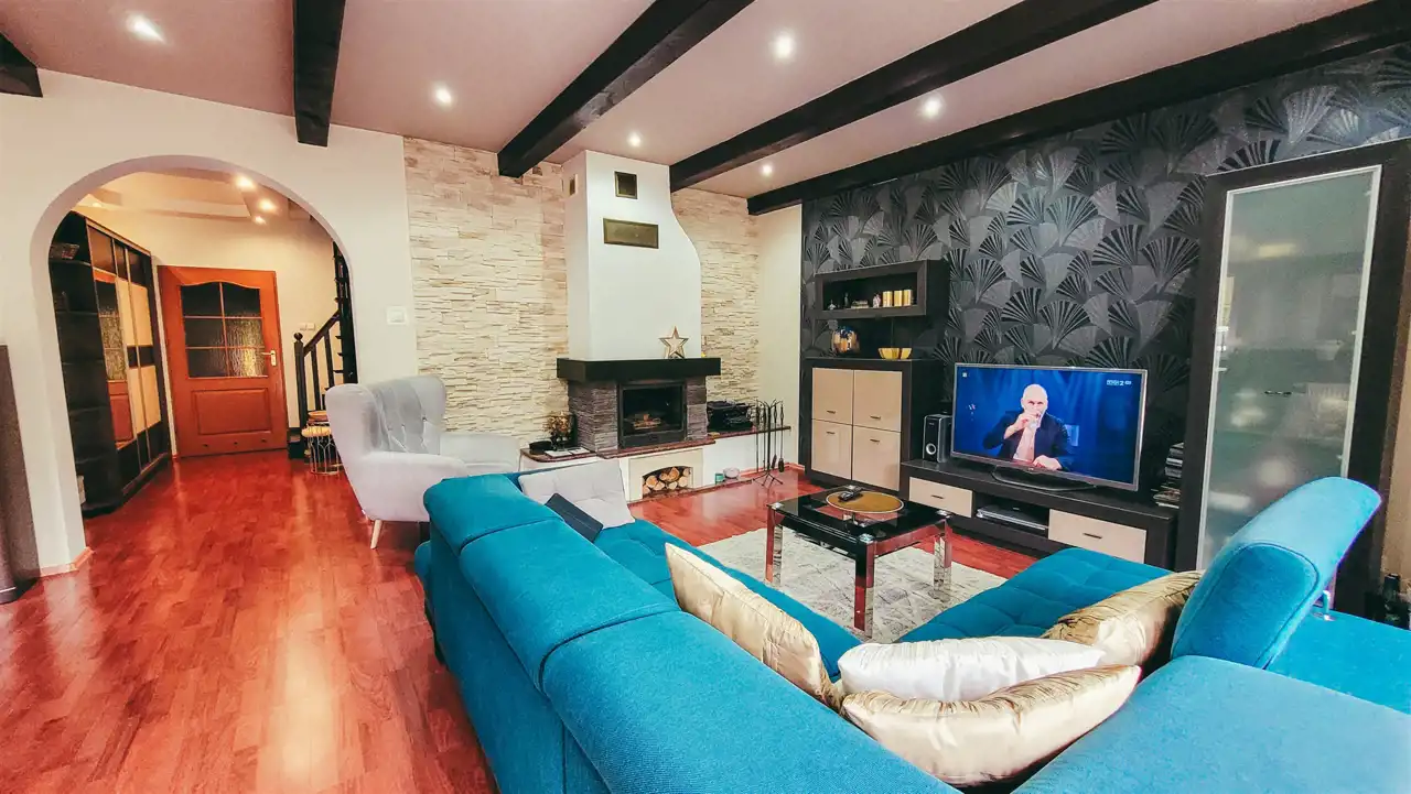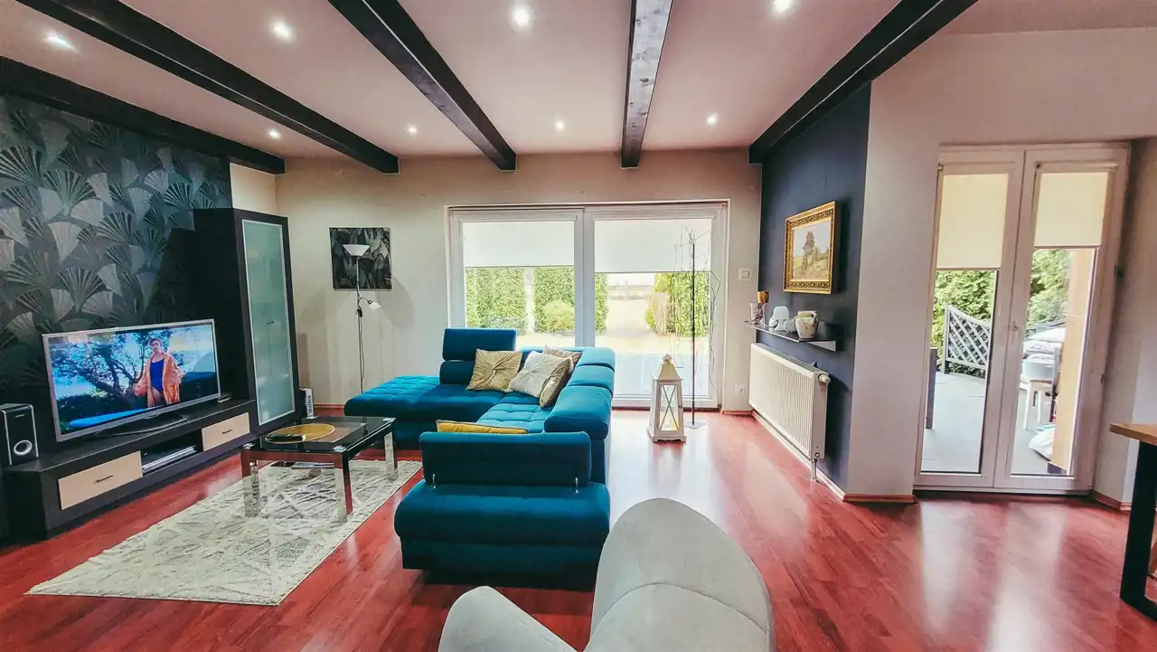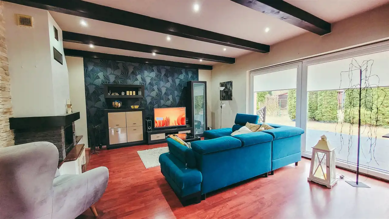 - przestronny salon z klimatycznym kominkiem i wyjściem na taras