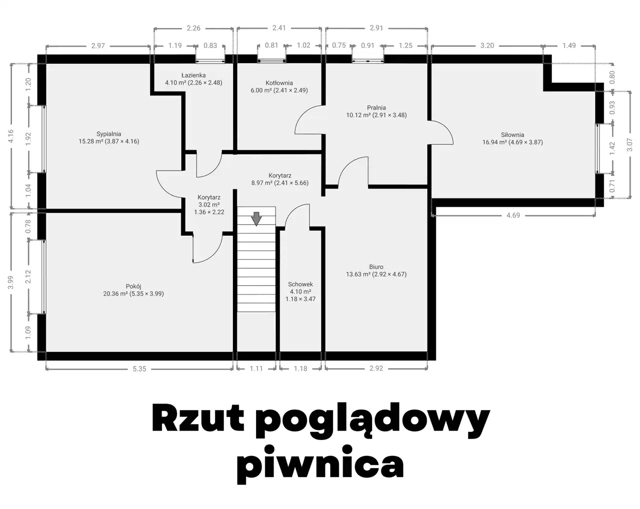Strefę gospodarczą - piwnica: 2 pokoje, gabinet, pomieszczenie gospodarcze - kotłownia, pralnia, siłownia.