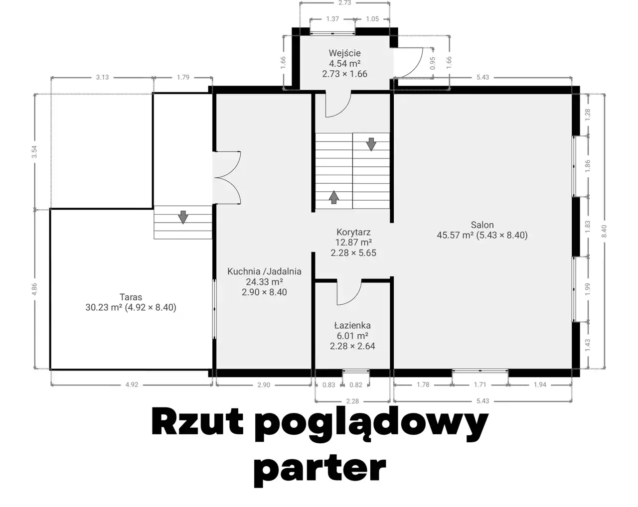 Strefę dzienną - parter: przestronny salon, kuchnię otwartą na jadalnię z przejściem na taras, łazienkę i hol.
