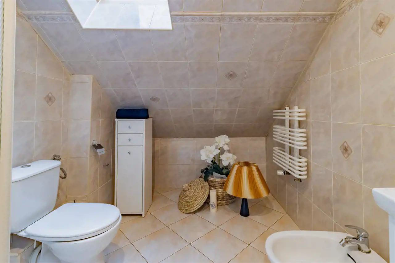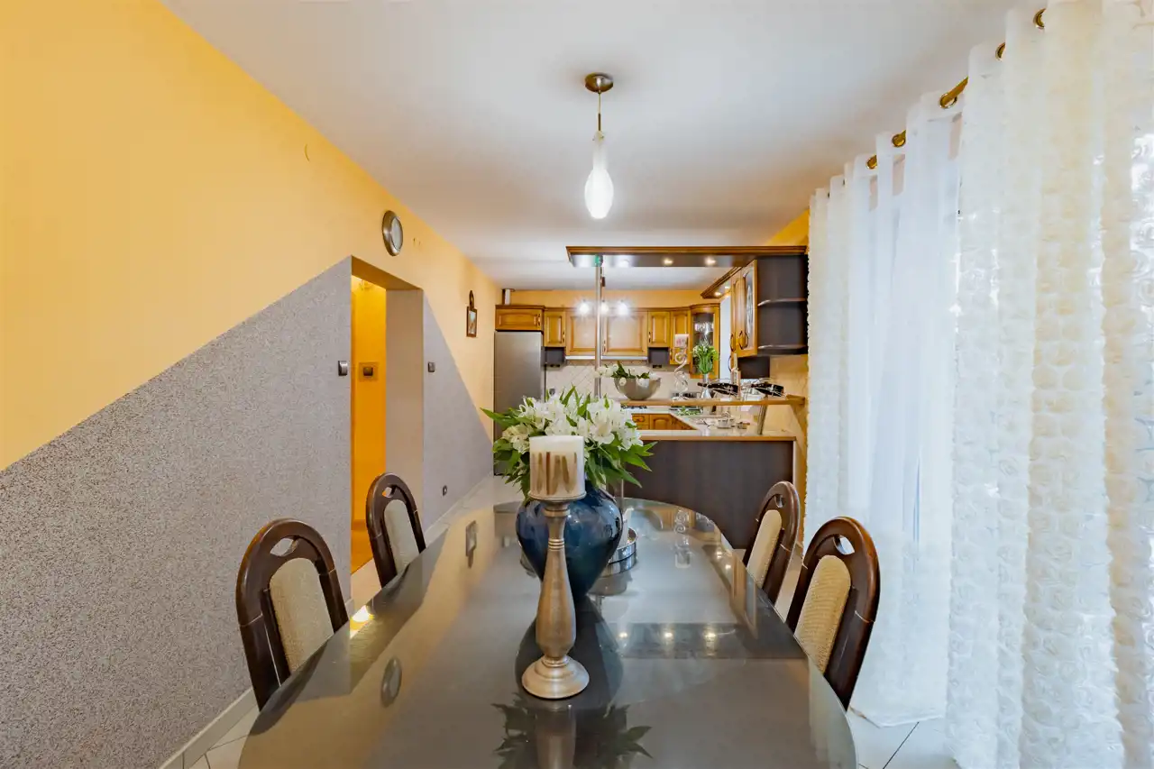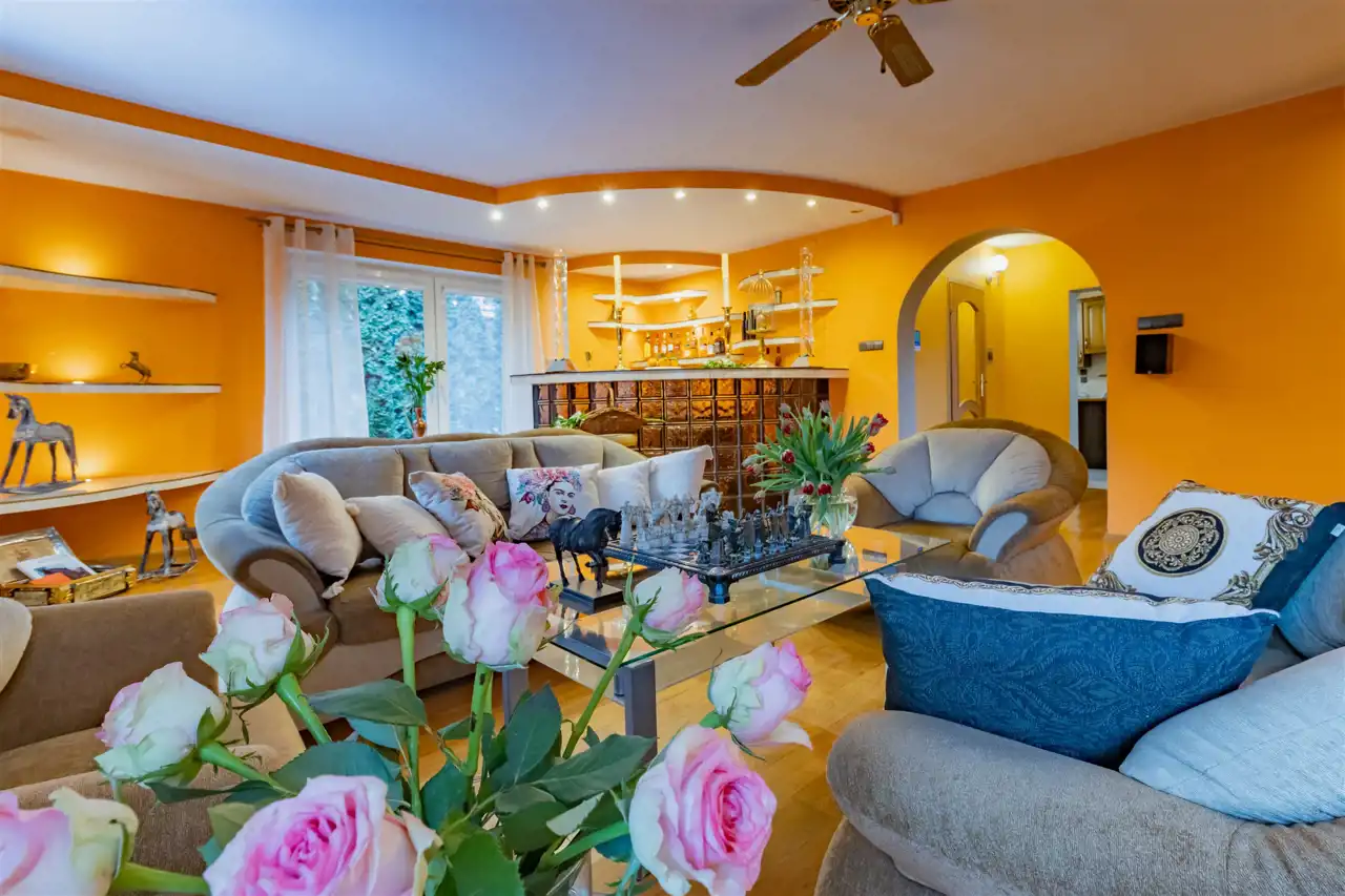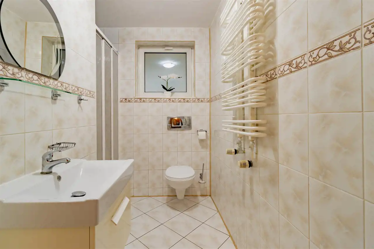 Bryła budynku zwraca uwagę proporcjami i detalem charakterystycznym dla architektury XX wieku. Klasyczna forma, solidne wykonanie i wyważona estetyka sprawiają, że nieruchomość zachowuje ponadczasowy charakter. Taras stanowi naturalne przedłużenie strefy dziennej, optycznie poszerzając bryłę budynku i tworząc miejsce sprzyjające wypoczynkowi. Balkon na wyższej kondygnacji harmonijnie dopełnia architekturę domu, oferując kameralną przestrzeń relaksu oraz przyjemny widok na otoczenie. Połączenie funkcjonalności z eleganckim wyglądem tworzy przestrzeń komfortową w codziennym użytkowaniu, a jednocześnie wyróżniającą się indywidualnym stylem. Dom został w całości podpiwniczony i mamy również do wykorzystania przestrzeń na użytkowym poddaszu, co zapewnia dużą funkcjonalność oraz czytelny podział przestrzeni na strefy: