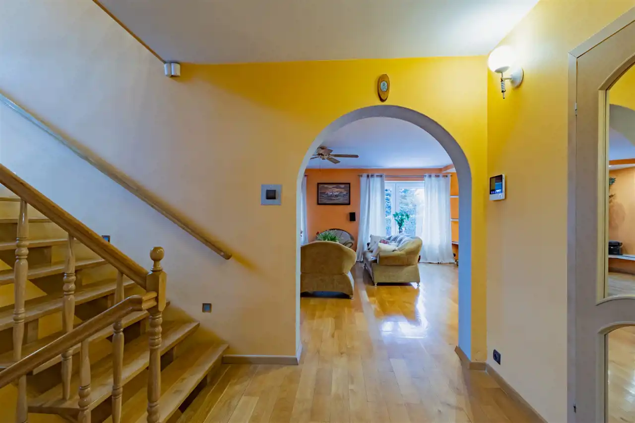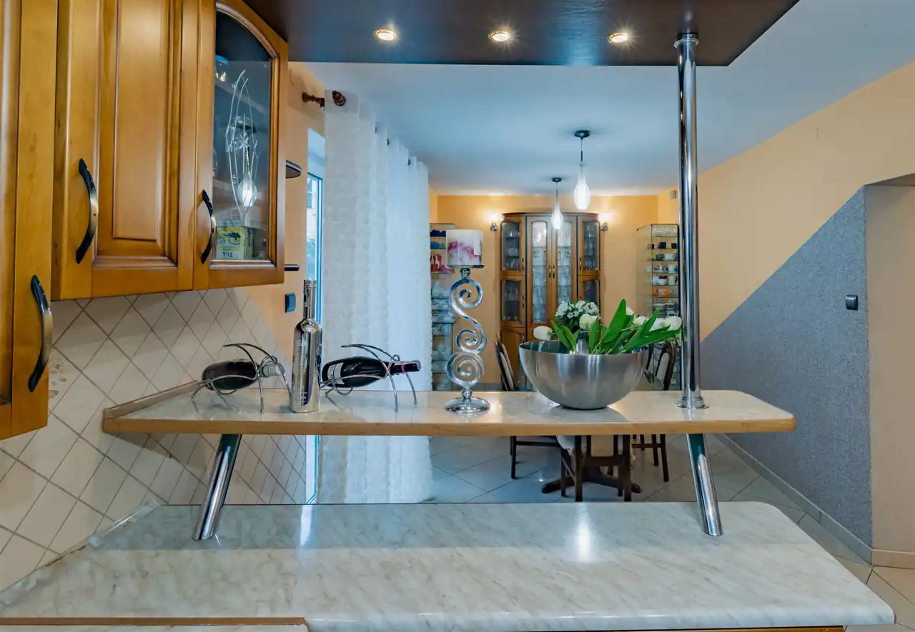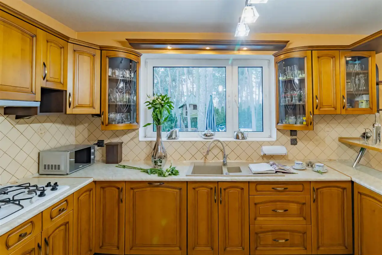 - Zastosowanie wysokiej jakości materiałów wykończeniowych, w tym elementów z naturalnego drewna dębowego, nadaje wnętrzom ponadczasowy charakter oraz zapewnia trwałość na lata. Drewniane detale i solidna stolarka podkreślają elegancję pomieszczeń, a zabudowa kuchenna wykonana z litego dębu łączy estetykę z odpornością na codzienne użytkowanie, zachowując swój wygląd mimo upływu czasu.