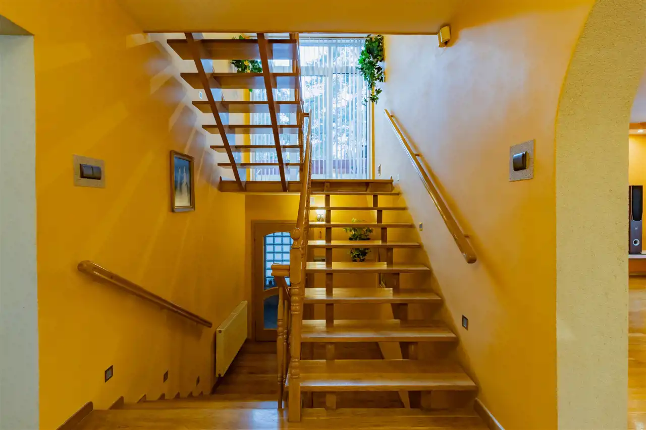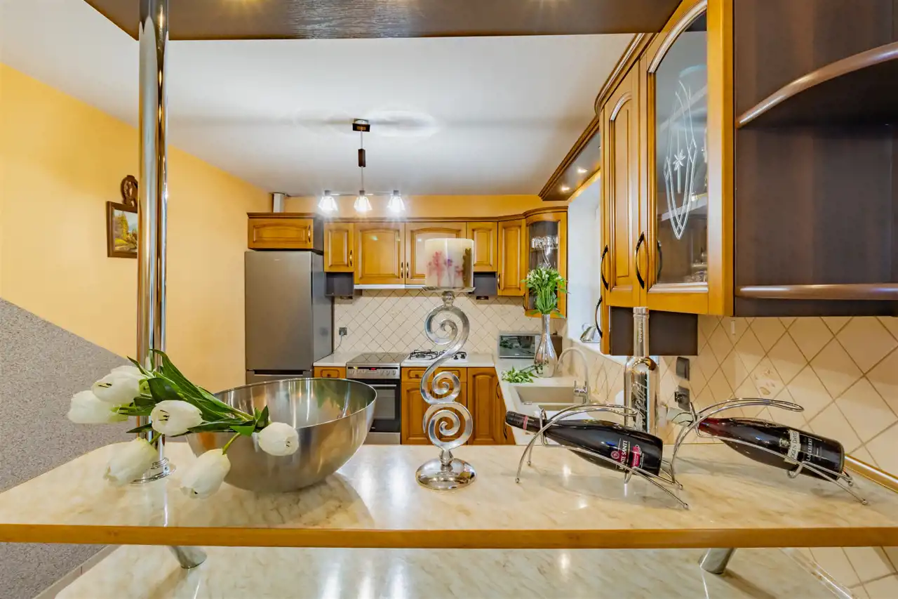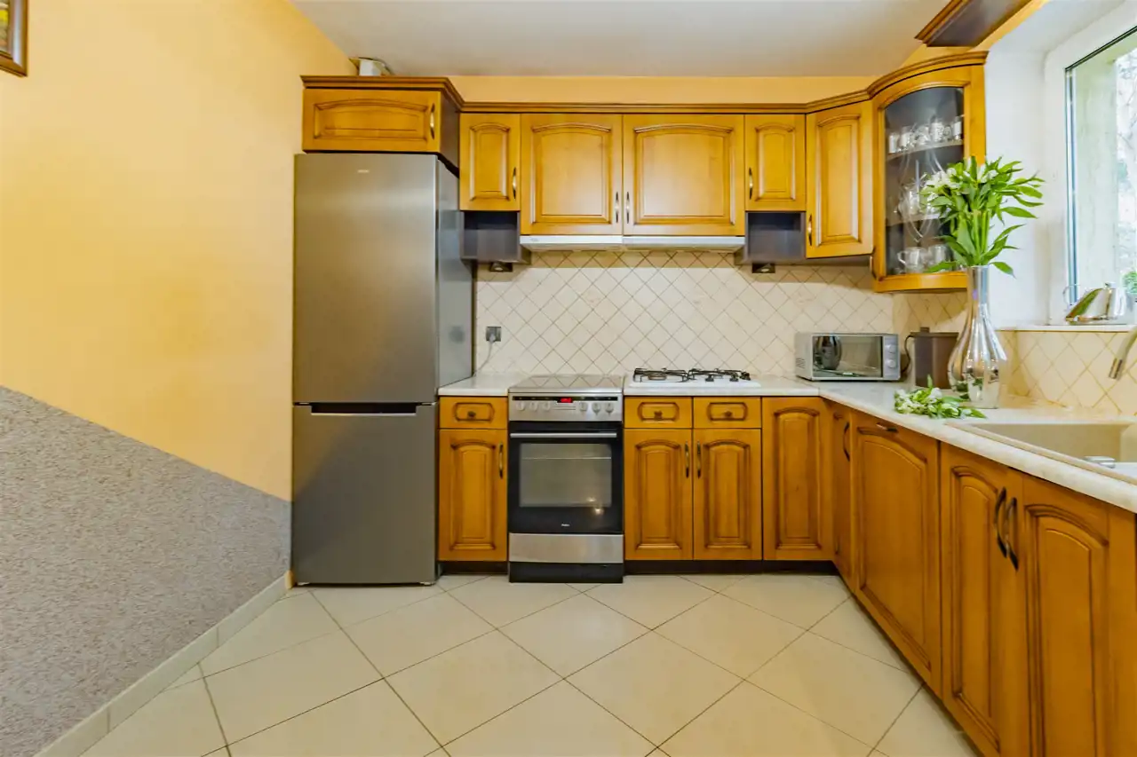 - Zastosowanie wysokiej jakości materiałów wykończeniowych, w tym elementów z naturalnego drewna dębowego, nadaje wnętrzom ponadczasowy charakter oraz zapewnia trwałość na lata. Drewniane detale i solidna stolarka podkreślają elegancję pomieszczeń, a zabudowa kuchenna wykonana z litego dębu łączy estetykę z odpornością na codzienne użytkowanie, zachowując swój wygląd mimo upływu czasu.