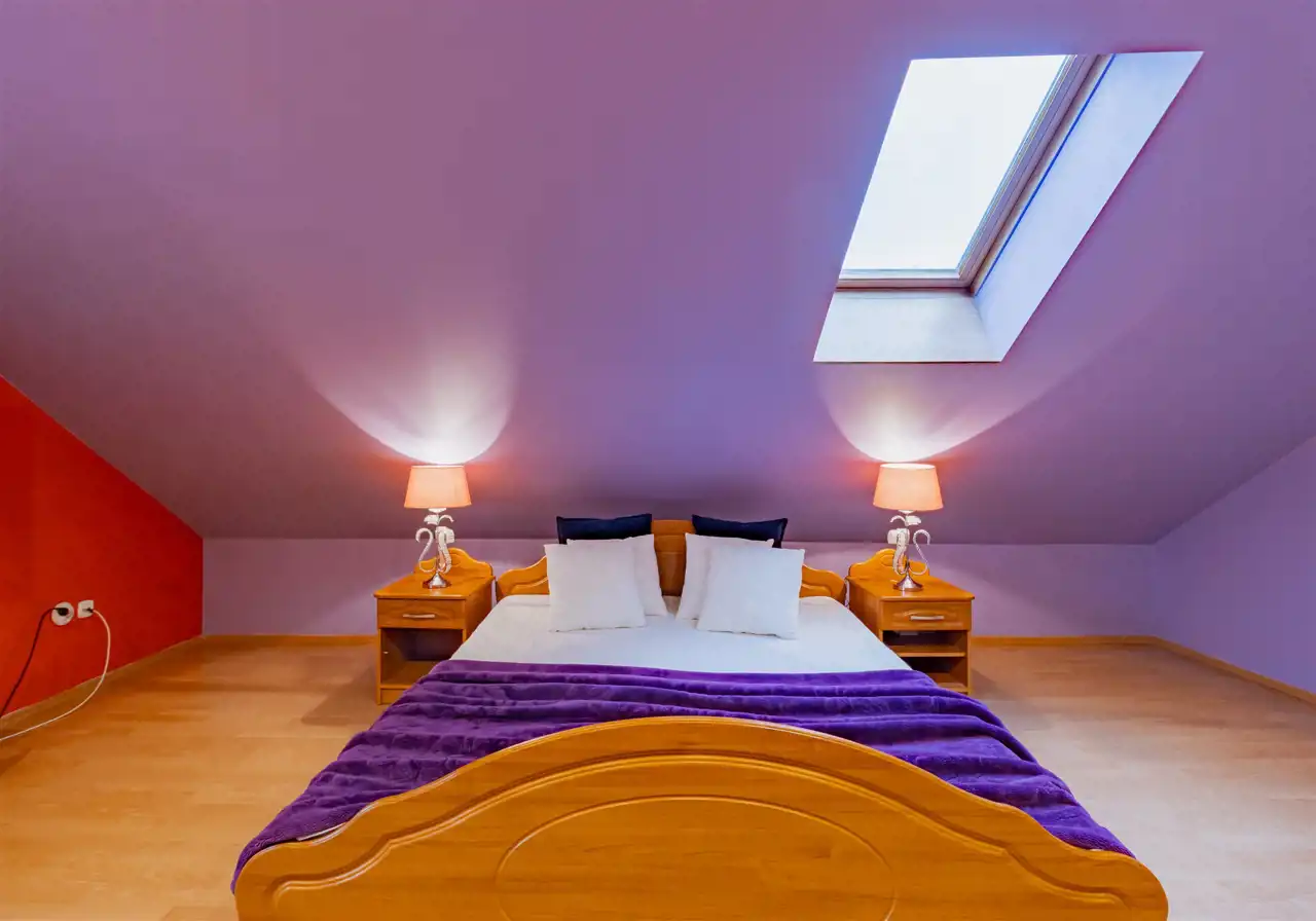 - Dach dwuspadowy, pokryty blachodachówką - pełne deskowanie (ocieplony wełną mineralną)