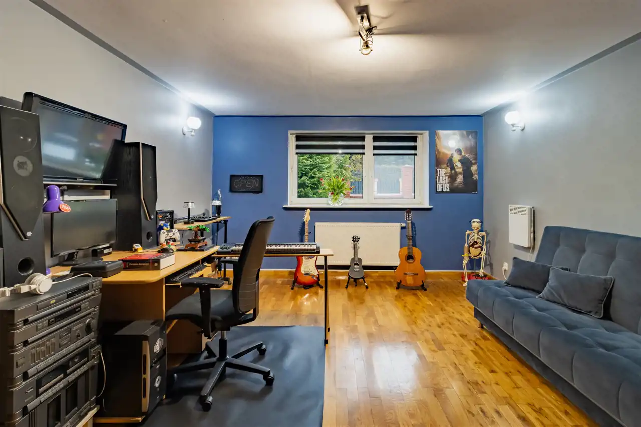 - Siłownia - prywatna strefa rekreacyjna w obrębie domu, umożliwiająca regularną aktywność fizyczną o dowolnej porze dnia, niezależnie od pogody. To komfortowe rozwiązanie dla osób dbających o zdrowie i kondycję, zapewniające wygodę oraz oszczędność czasu bez konieczności dojazdów na treningi.