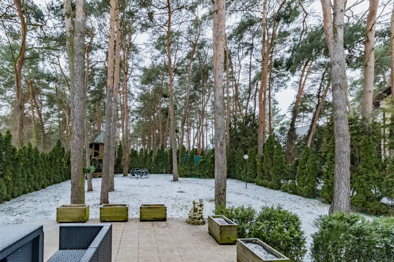 - Naturalna osłona przed słońcem - wysokie świerki w pobliżu tarasu zapewniają cień w letnie dni, pozwalając cieszyć się wypoczynkiem na świeżym powietrzu bez nadmiernego nasłonecznienia.