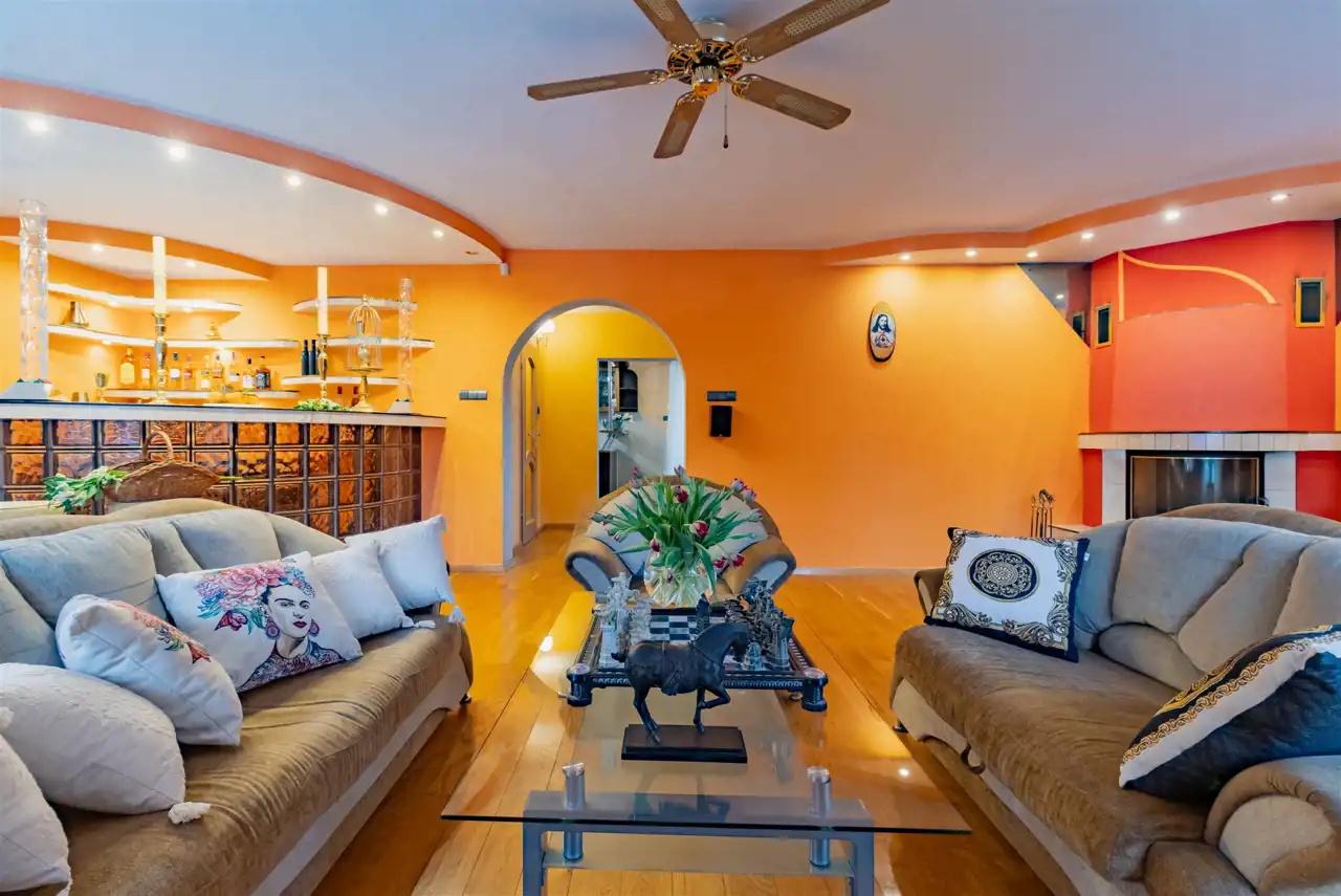 - Salon z kominkiem stanowi naturalne centrum domu i tworzy przytulną atmosferę sprzyjającą odpoczynkowi, szczególnie w chłodniejsze dni. Duże okna zapewniają bardzo dobre doświetlenie wnętrza oraz poczucie przestrzeni i kontaktu z otoczeniem. Dodatkowy barek podnosi funkcjonalność pomieszczenia, ułatwiając organizację spotkań towarzyskich i podkreślając reprezentacyjny charakter strefy dziennej.