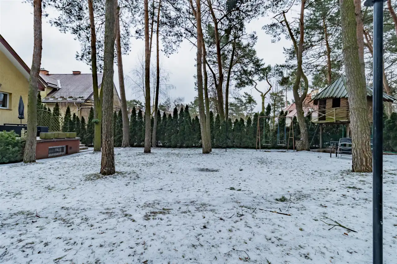 - Na działce znajduje się drewniany domek stanowiący bezpieczną i atrakcyjną przestrzeń do zabawy dla dzieci. Dzięki temu najmłodsi mogą spędzać czas na świeżym powietrzu w obrębie posesji, a domownicy zyskują wygodę codziennej opieki i większy komfort użytkowania ogrodu.