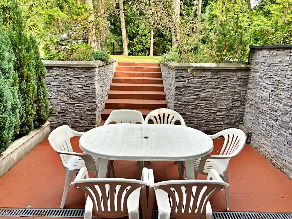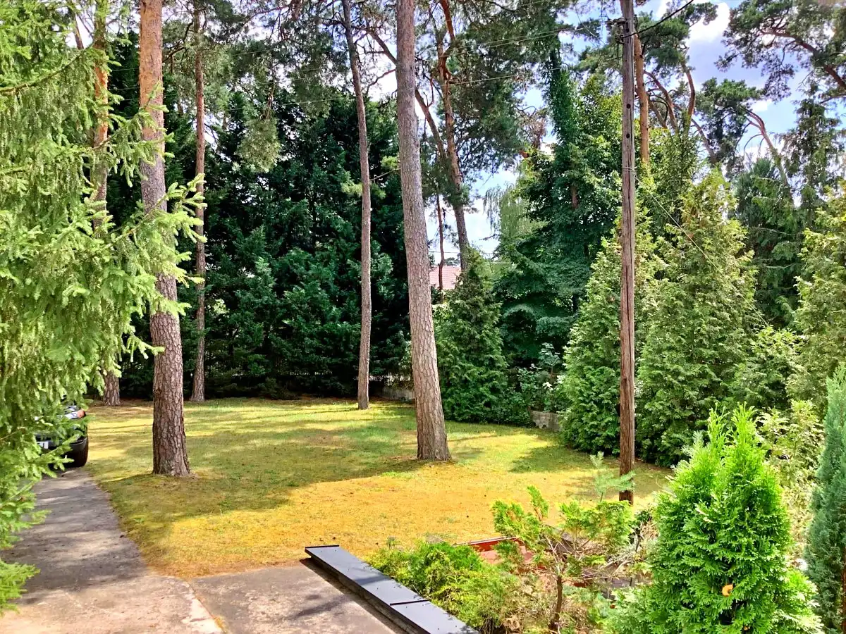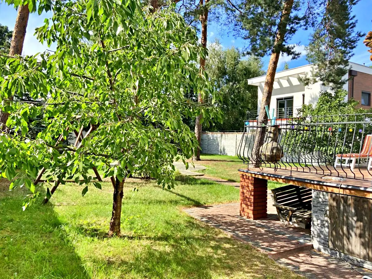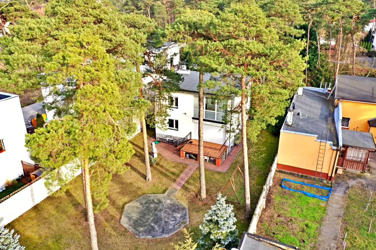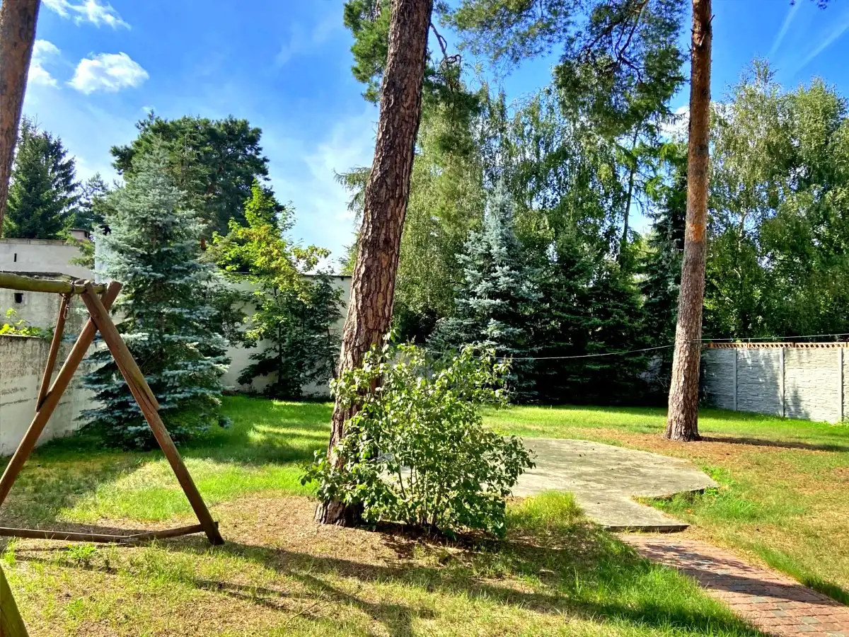 Nieruchomość otoczona piękną, zagospodarowaną działką z licznymi krzewami i drzewami, w tym wysokimi świerkami, które nadają miejscu wyjątkowy klimat.