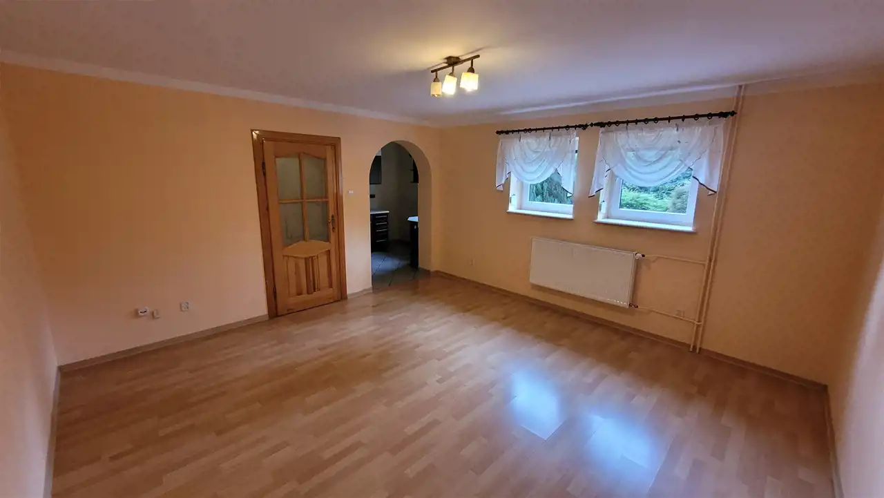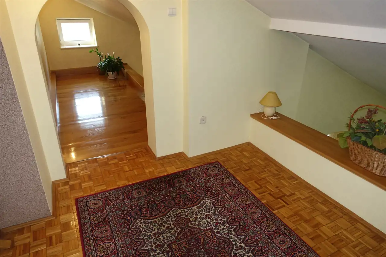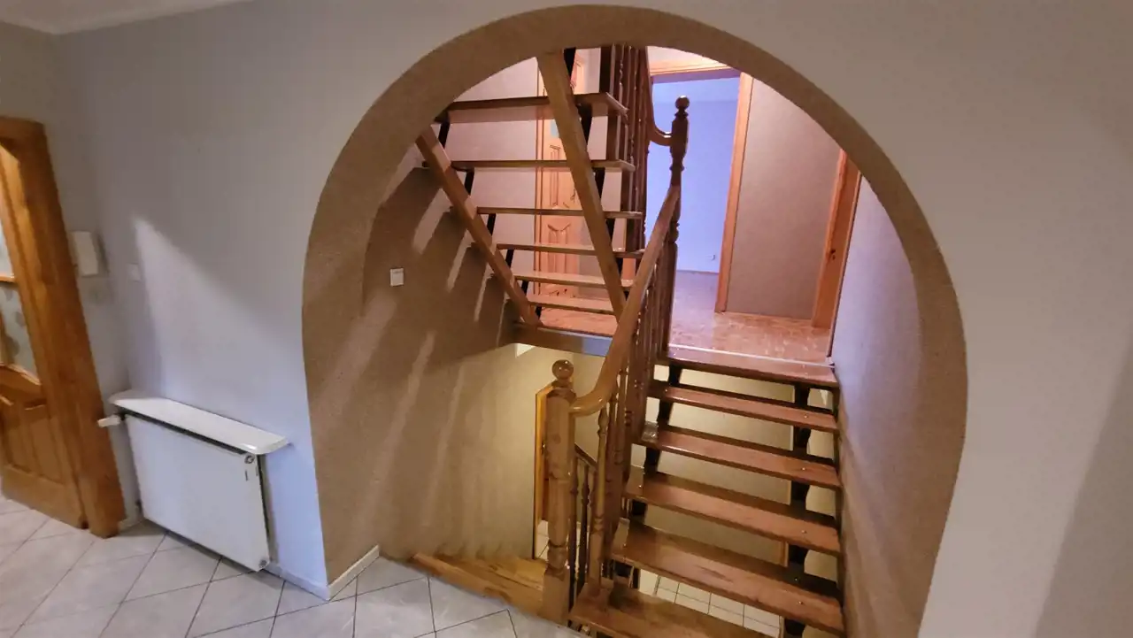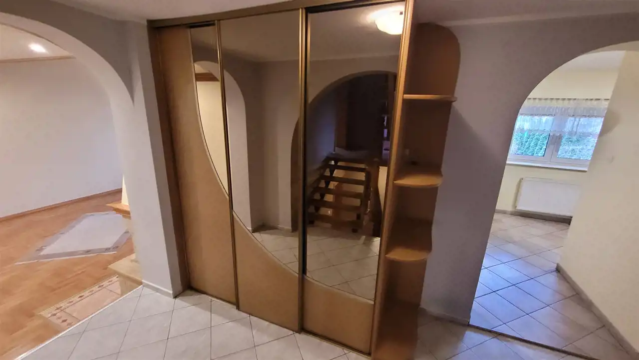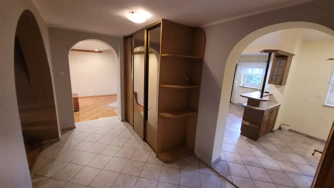 Składa się z kilku kondygnacji: parteru, półpiętra, piętra oraz piwnicy wyłożonej płytkami z osobnym wejściem. Podłogi w pokojach wyłożone pięknie utrzymanym parkietem/ panelami nowego typu, w kuchniach i łazienkach gres, natomiast na ścianach w pokojach gładzie, w kuchniach i łazienkach glazura.