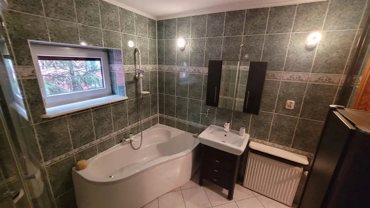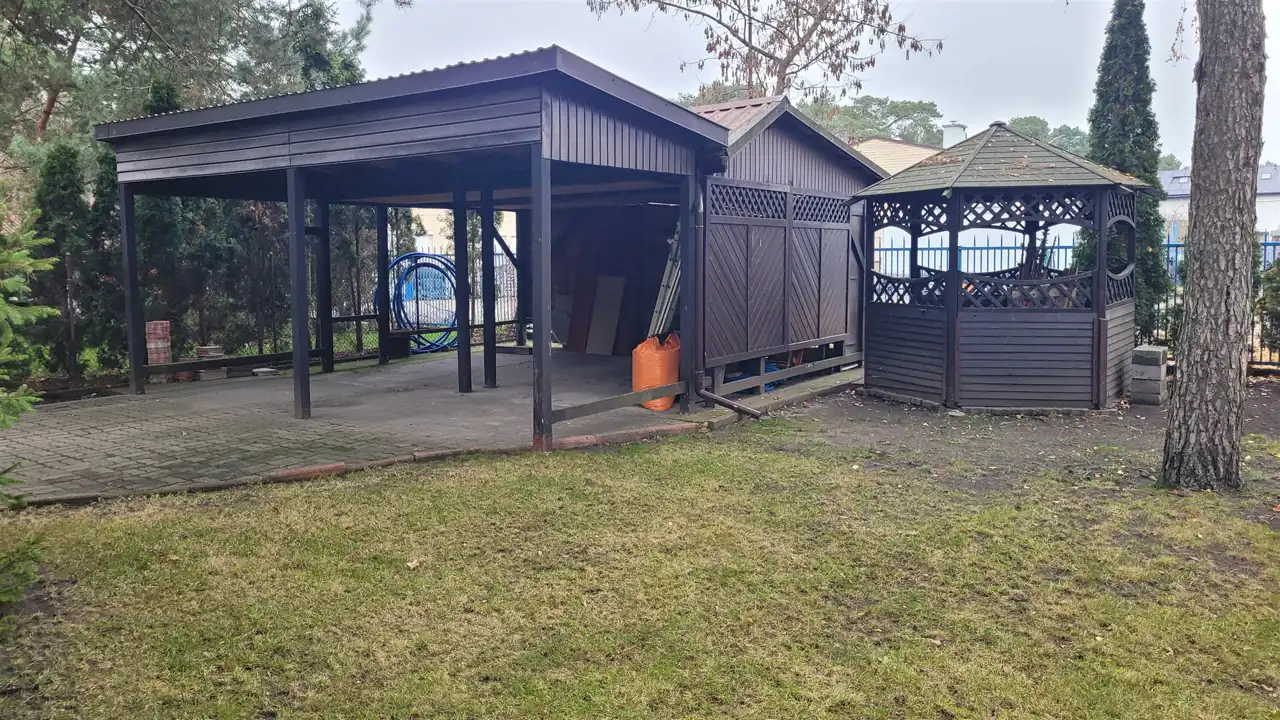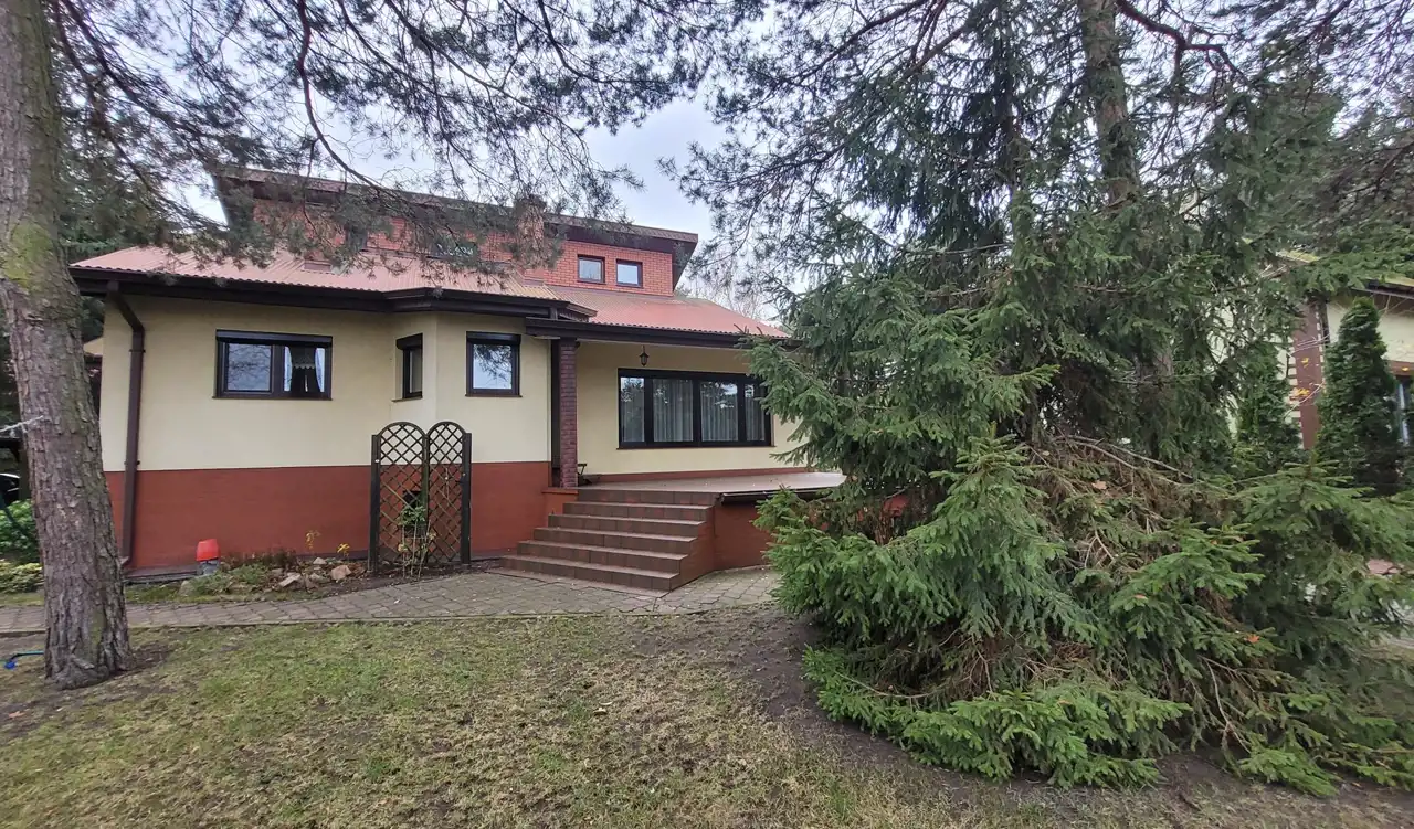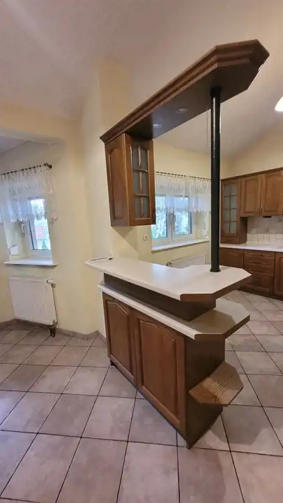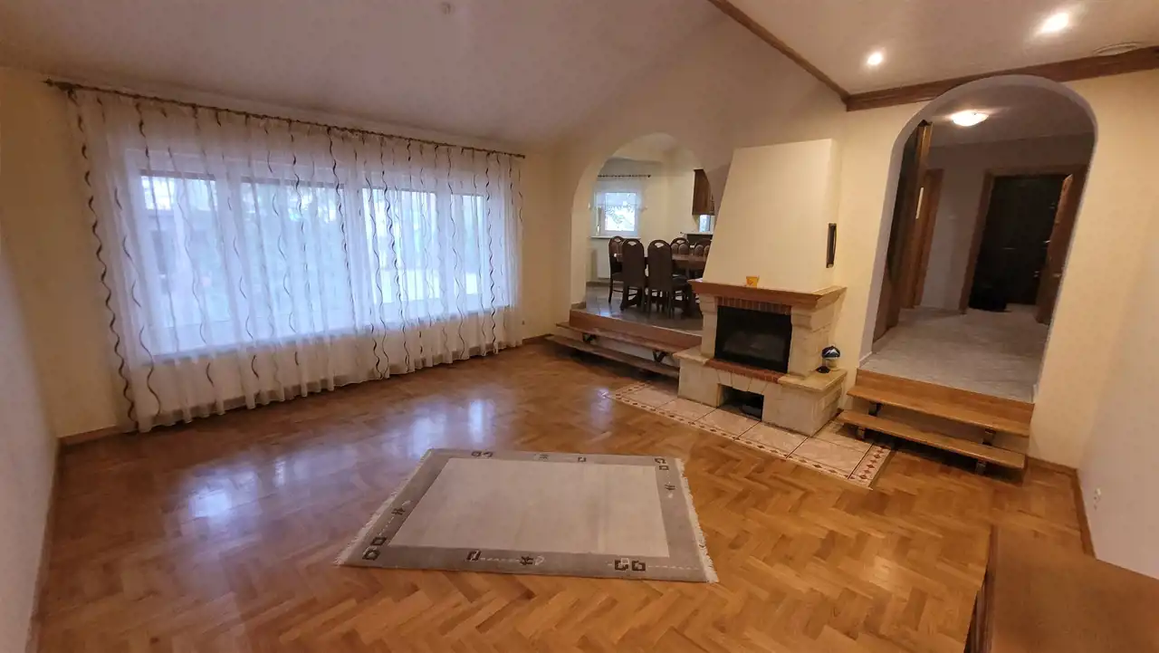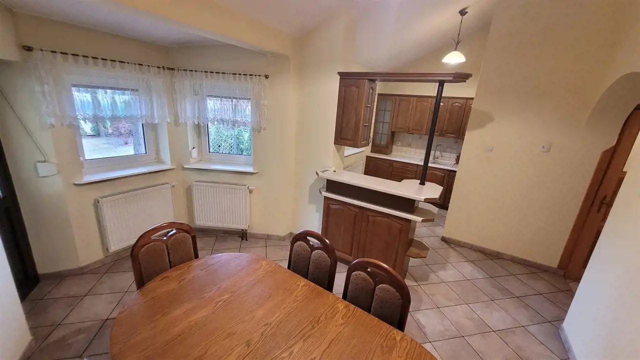 Nieruchomość posiada: salon z antresolą, kominkiem oraz 6 pokoi, 2 kuchnie, jadalnia i wyjściem na taras, 2 łazienki, wc. W skład piwnicy wchodzi pralnia z suszarnią i prasowalnią, spiżarnia, kotłownia, duże widne pomieszczenie na siłownię. Garaż jednostanowiskowy w bryle budynku. Wiata na 2 samochody, altana.