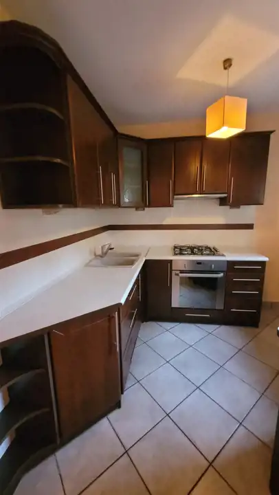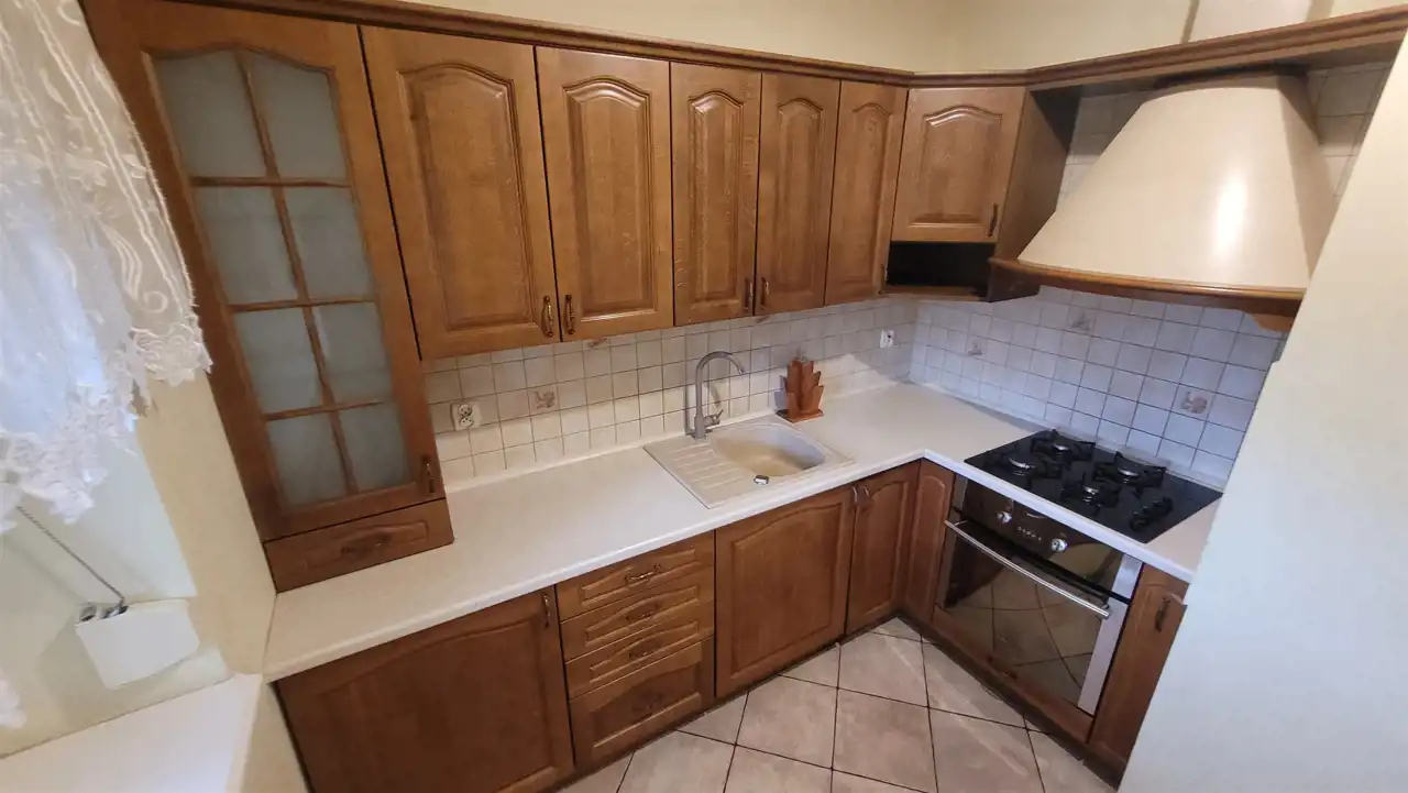 W cenie pozostają w obu kuchniach drewniane meble w zabudowie.