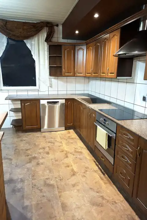 • Wyposażenie: meble w zabudowie, sprzęt AGD (piekarnik, zmywarka, lodówka), szafy w zabudowie
