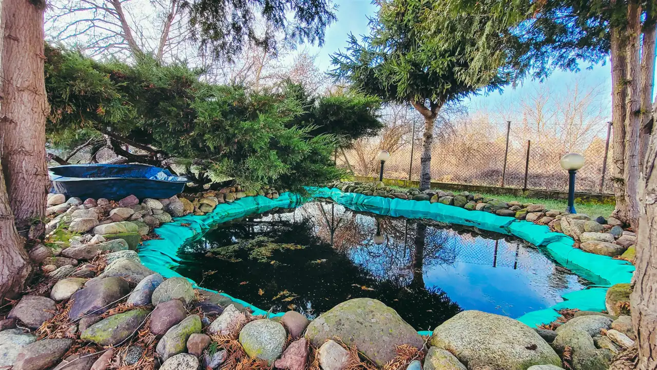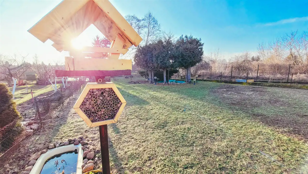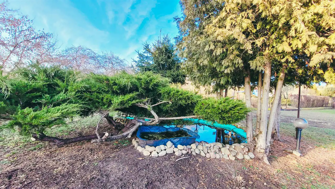 h) brak opłat za wodę na terenie ROD, niskie opłaty roczne oraz za prąd, osobne mini-szambo z beczki dla kranów zewnętrznych i wewnętrznych, latarnia z osłoniętym gniazdkiem elektrycznym przy oczku wodnym
