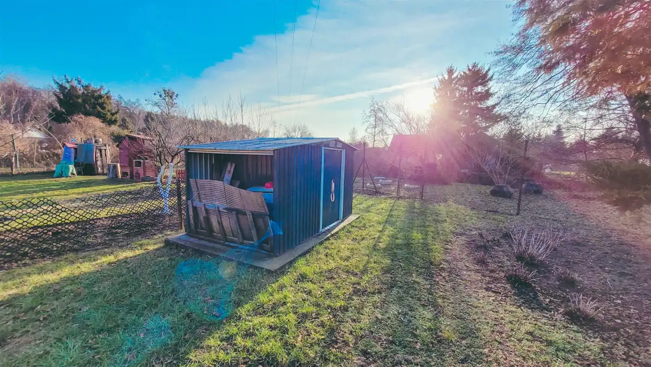 b) mnogość narzędzi i sprzętów, które zostawiam w pakiecie – dwie kosiarki elektryczne (jedna do trawy na działce, druga na teren za płotem żeby nie przenosić chwastów), podkaszarka, rębak do drewna, duże taczki, piła elektryczna do żywopłotów, piła elektryczna, pompa głębinowa do oczka wodnego i podbierak, komplet grabi, szpadli, wideł, łopat, pił, nożyc, etc., przedłużacze, drobne narzędzia, kilkanaście puszek do farb do samodzielnej aranżacji domku, nawozy i środki ochrony roślin