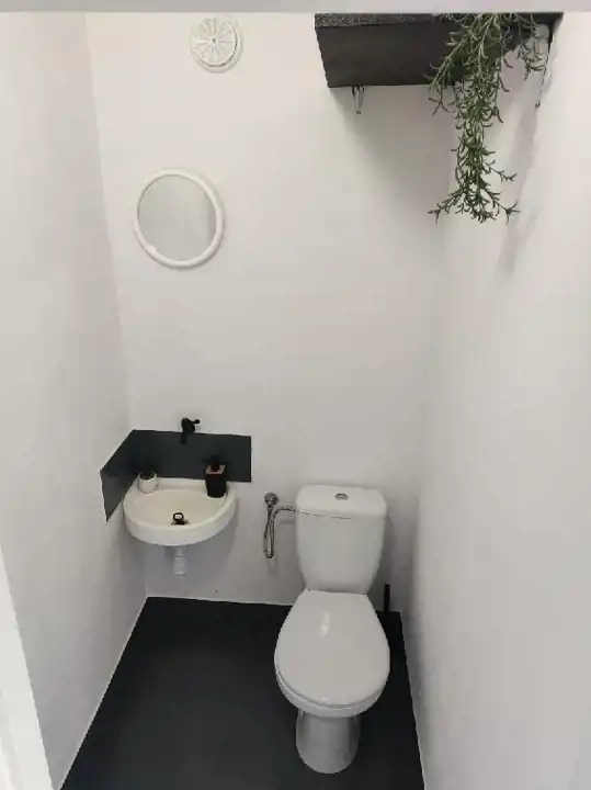 f) domek w dobrym stanie – co najwyżej trzeba odmalować sufit i wymienić dwa kafelki na schodach – na wysokim fundamencie, w pełni wyposażona kuchnia (grill elektryczny, naczynia, sztućce, lodówka, mikrofalówka) i łazienka (nowy sedes, półki, lustro, etc.). Łózko jest w dobrym stanie, szafy na ubrania również, na upartego nie trzeba nic dowozić