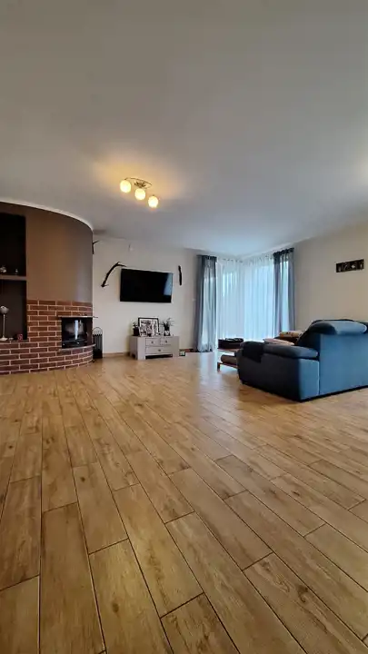 Duży ustawny salon połączony z wydzieloną częścią jadalnianą. Kuchnia w zabudowie z wszelkimi sprzętami. Klimatyczny kominek z płaszczem wodnym dopełnia to wnętrze.