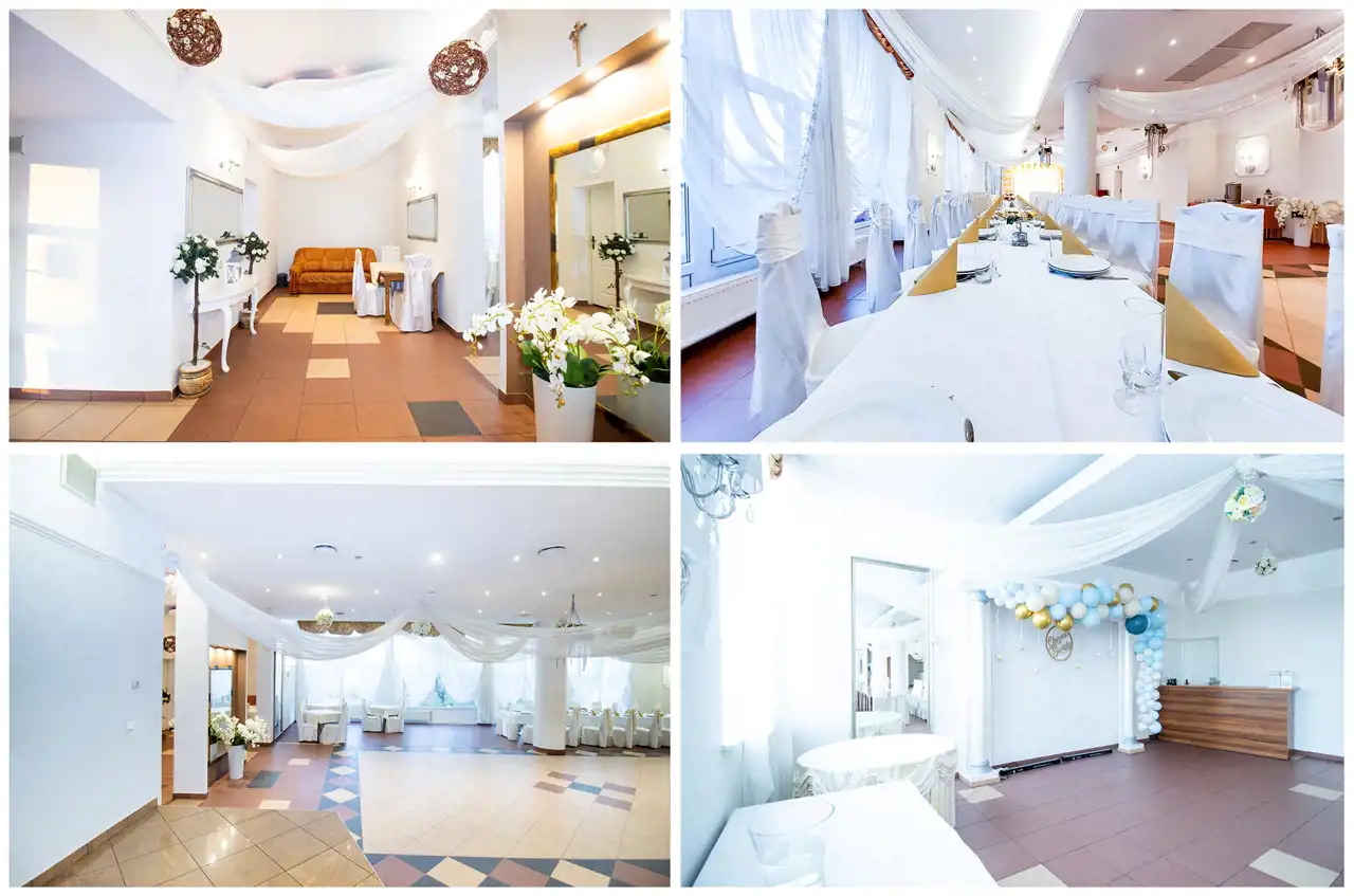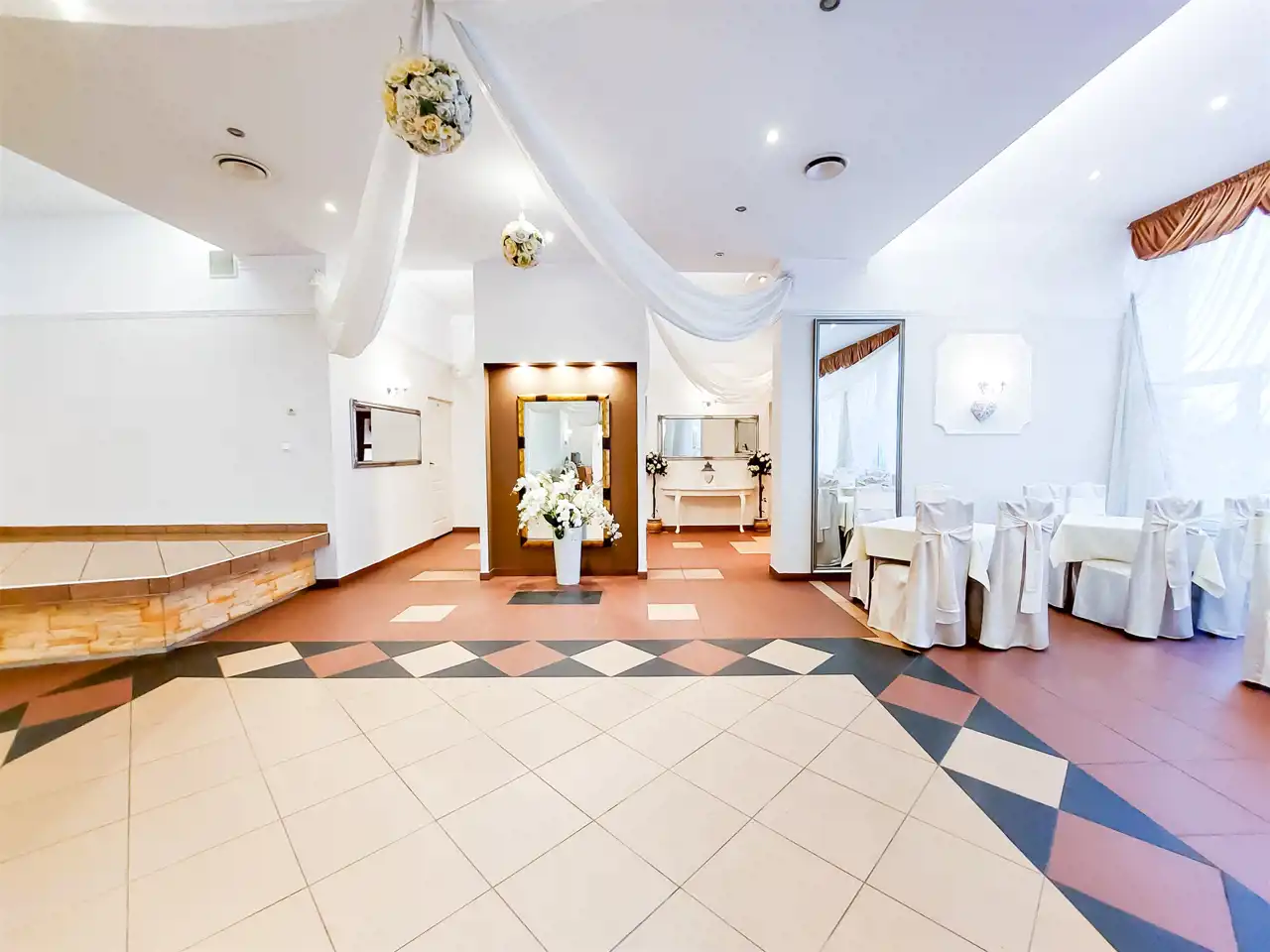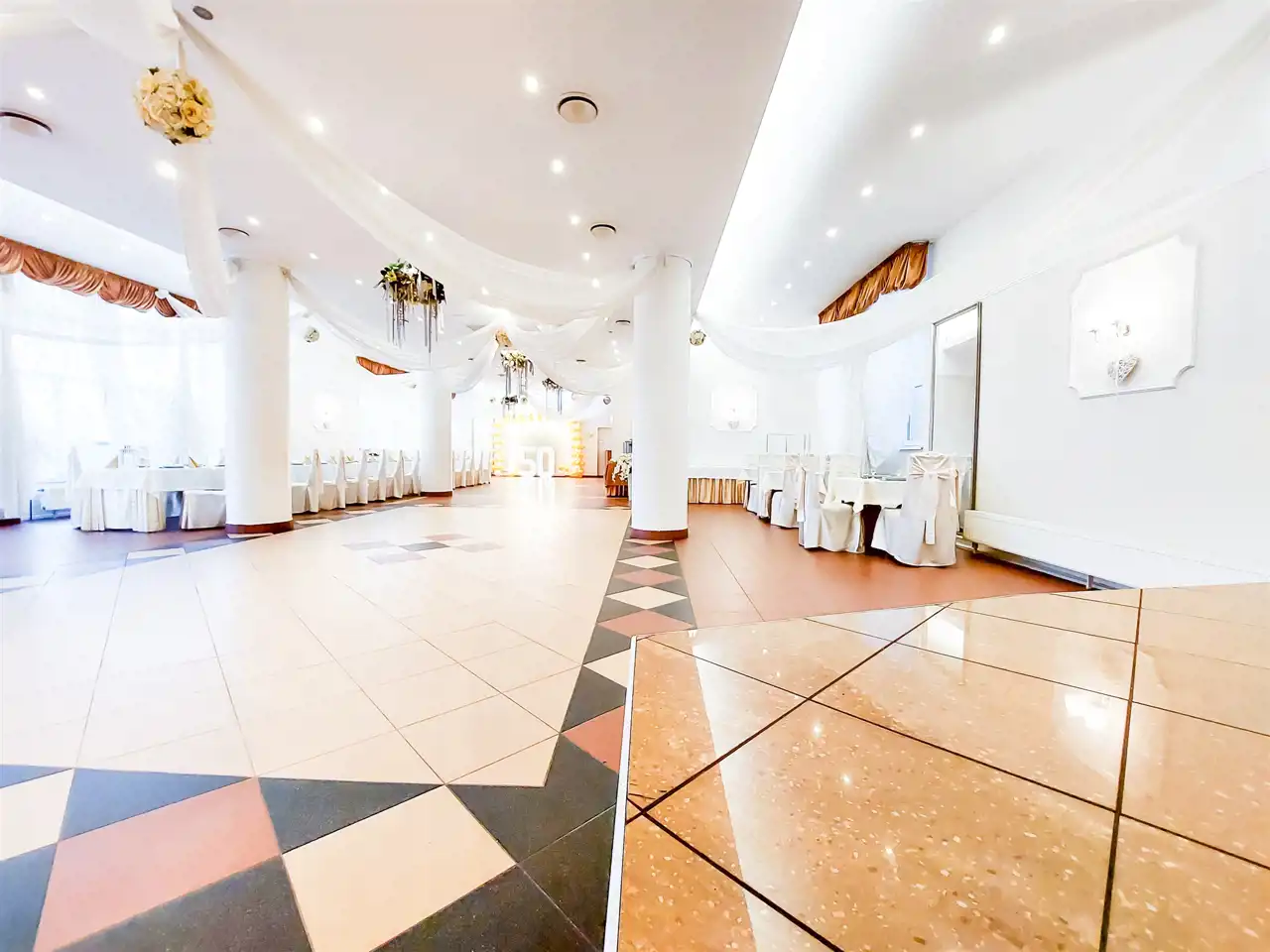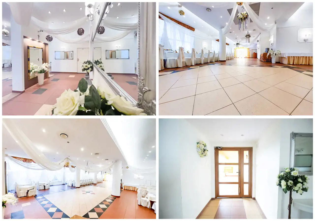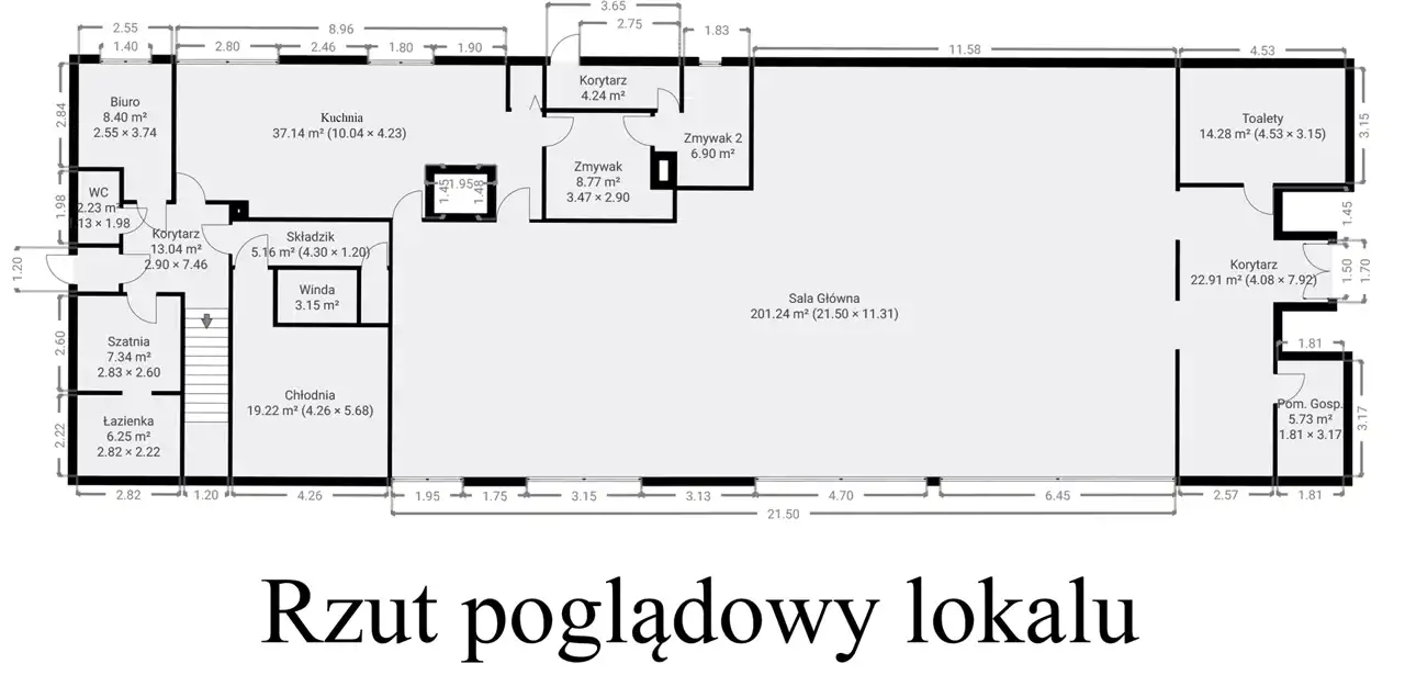 10 pomieszczeń: (zamykany schowek przy wejściu głównym 5,73 m2., duża sala 201,24 m2., dwa pomieszczenia gastronomiczne ze zmywalnią 8,77 m2 oraz 6,90 m2, pomieszczenie gastronomiczne 37,14 m2 , pokój 8,40 m2, schowek 5,16 m2, chłodnia spożywcza 19,22 m2, winda towarowa 3,15 m2, pokój 7,34 m2).