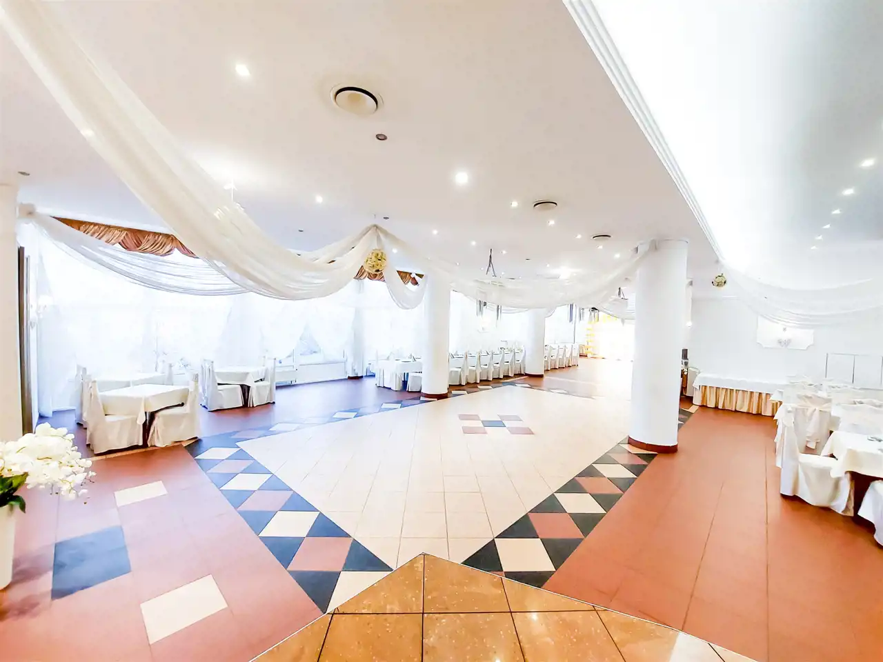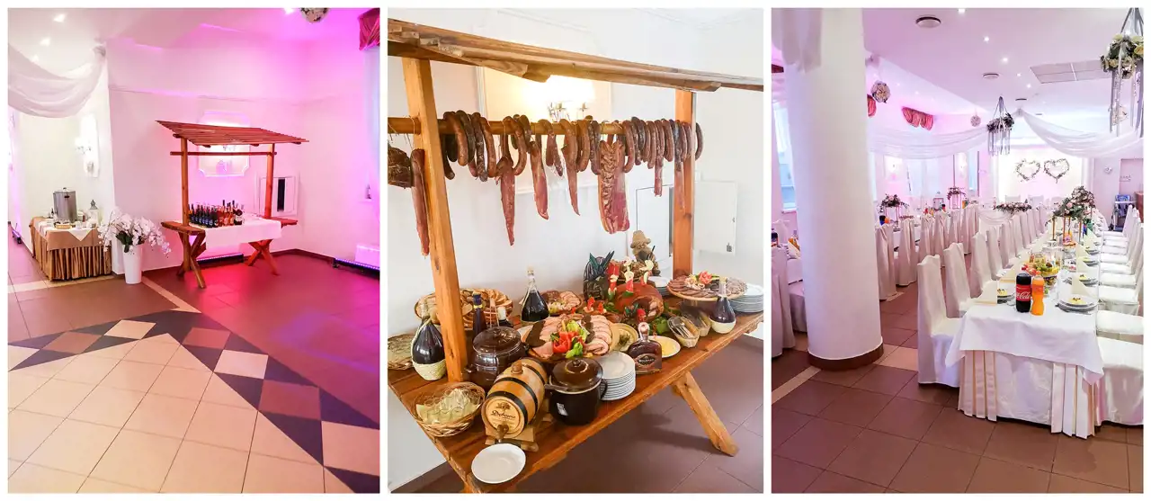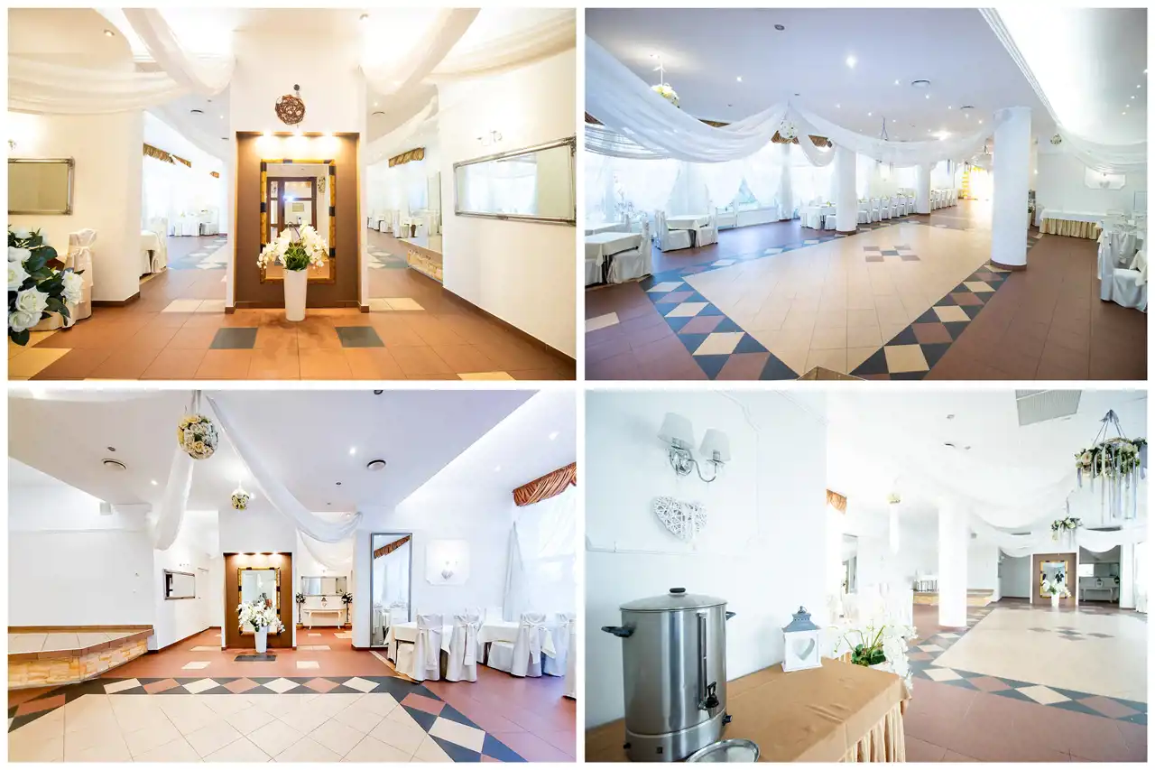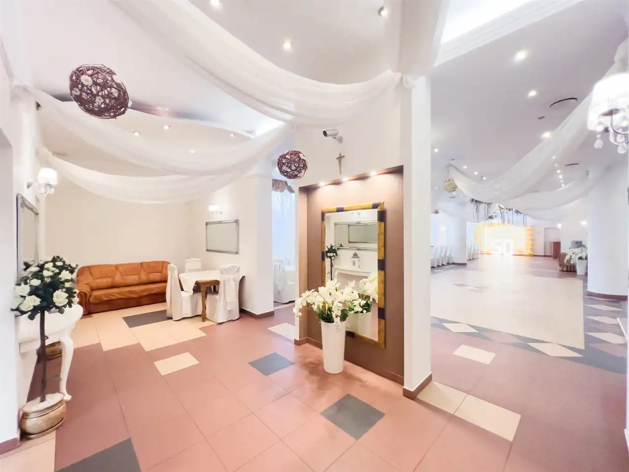 10 pomieszczeń: (zamykany schowek przy wejściu głównym 5,73 m2., duża sala 201,24 m2., dwa pomieszczenia gastronomiczne ze zmywalnią 8,77 m2 oraz 6,90 m2, pomieszczenie gastronomiczne 37,14 m2 , pokój 8,40 m2, schowek 5,16 m2, chłodnia spożywcza 19,22 m2, winda towarowa 3,15 m2, pokój 7,34 m2).