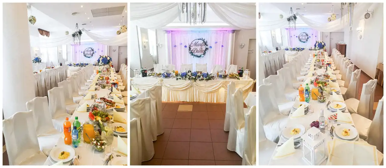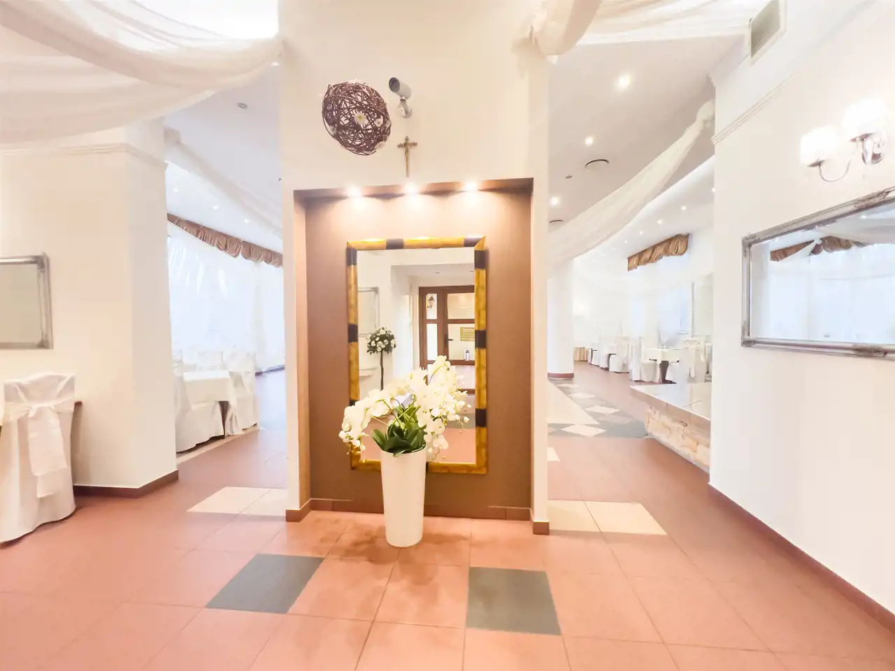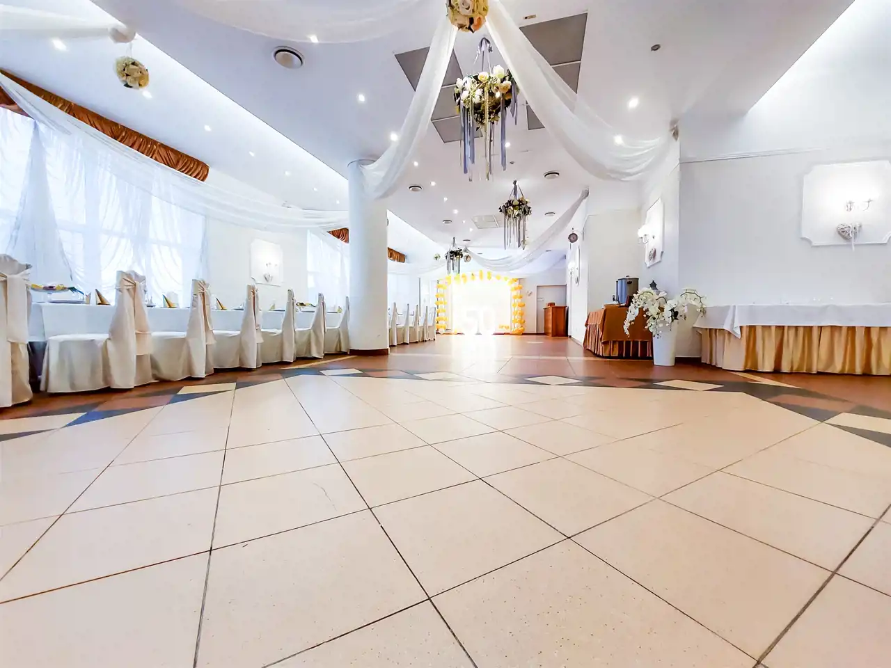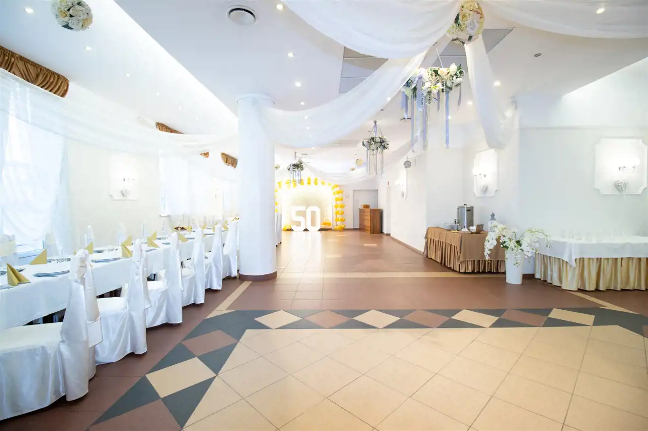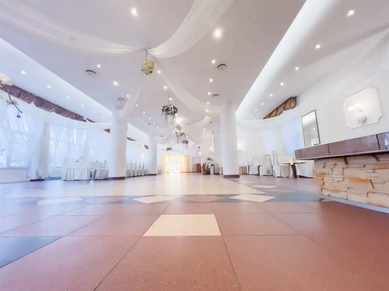 10 pomieszczeń: (zamykany schowek przy wejściu głównym 5,73 m2., duża sala 201,24 m2., dwa pomieszczenia gastronomiczne ze zmywalnią 8,77 m2 oraz 6,90 m2, pomieszczenie gastronomiczne 37,14 m2 , pokój 8,40 m2, schowek 5,16 m2, chłodnia spożywcza 19,22 m2, winda towarowa 3,15 m2, pokój 7,34 m2).