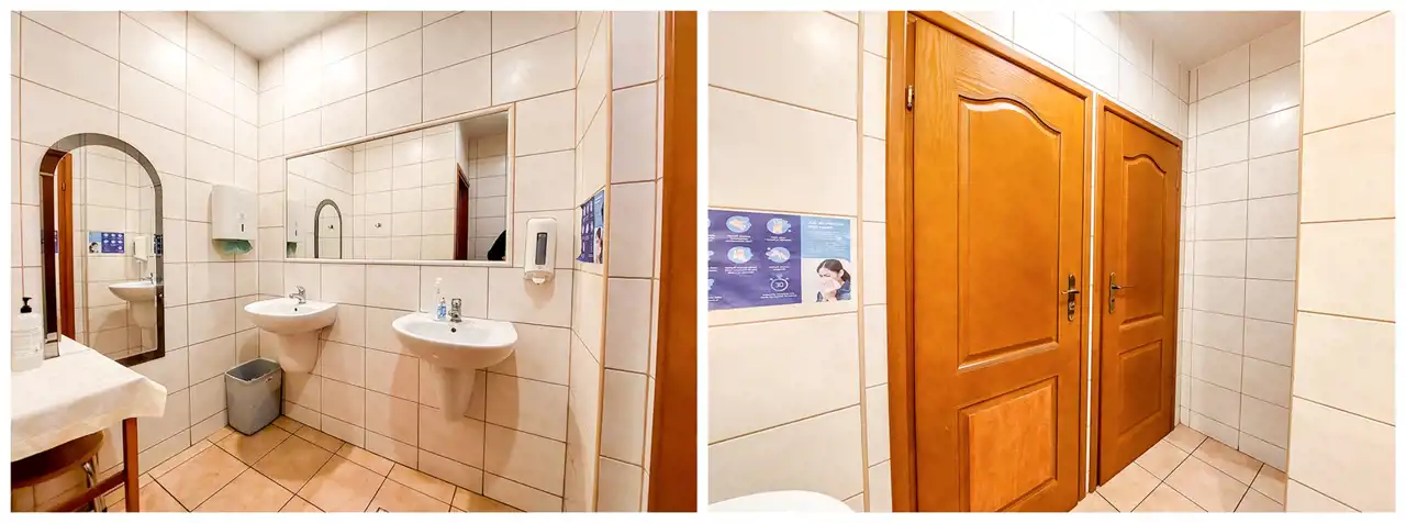 3 pomieszczenia sanitarne: (toaleta z trzema osobnymi WC 14,28 m2, toaleta z WC 2,23 m2, łazienka z pralnią 6,25 m2).