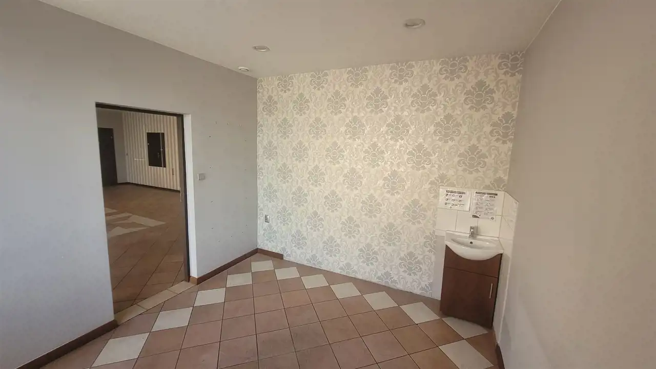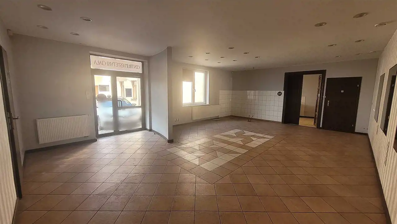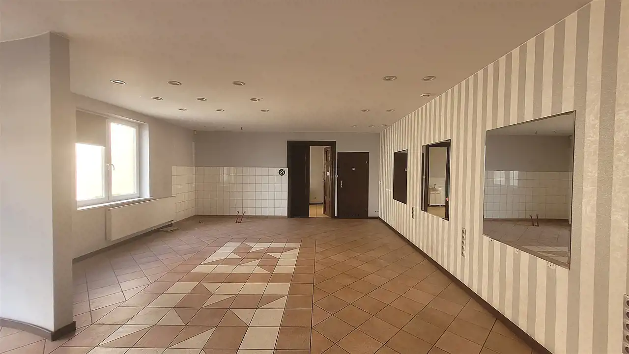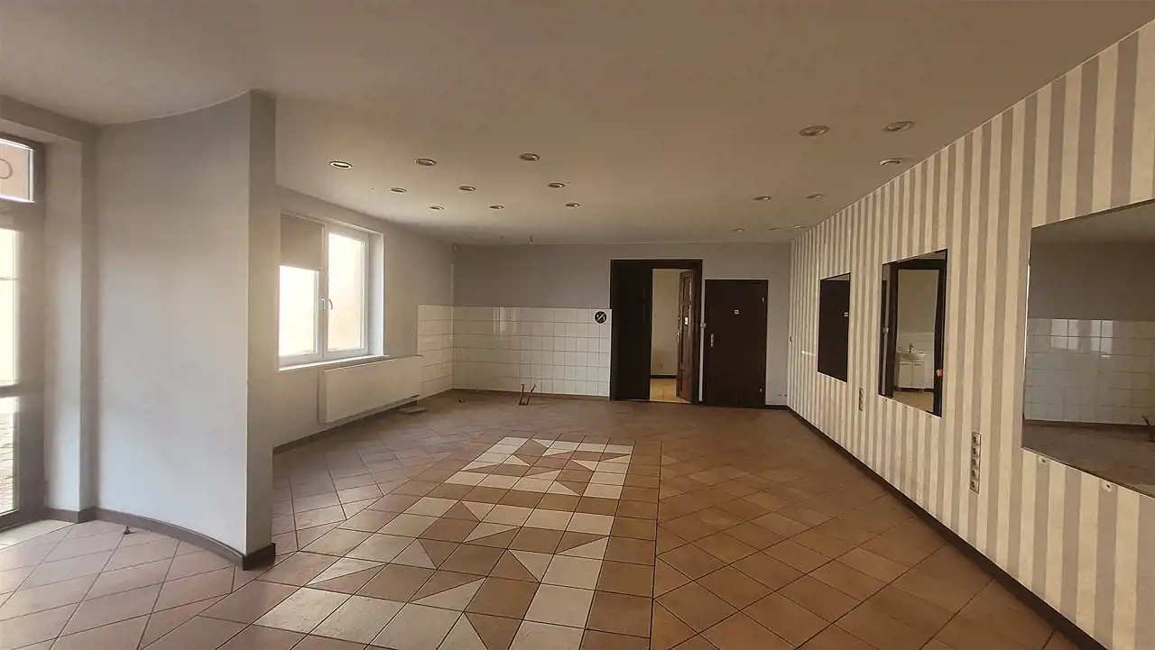 Nieruchomość mieści się na parterze piętrowego budynku obok innych lokali usługowych. Składa się z dużej sali usługowej (ok. 50 m2) i mniejszych widnych pomieszczeń (10/13m2) oraz pomieszczenia socjalnego i sanitarnego.